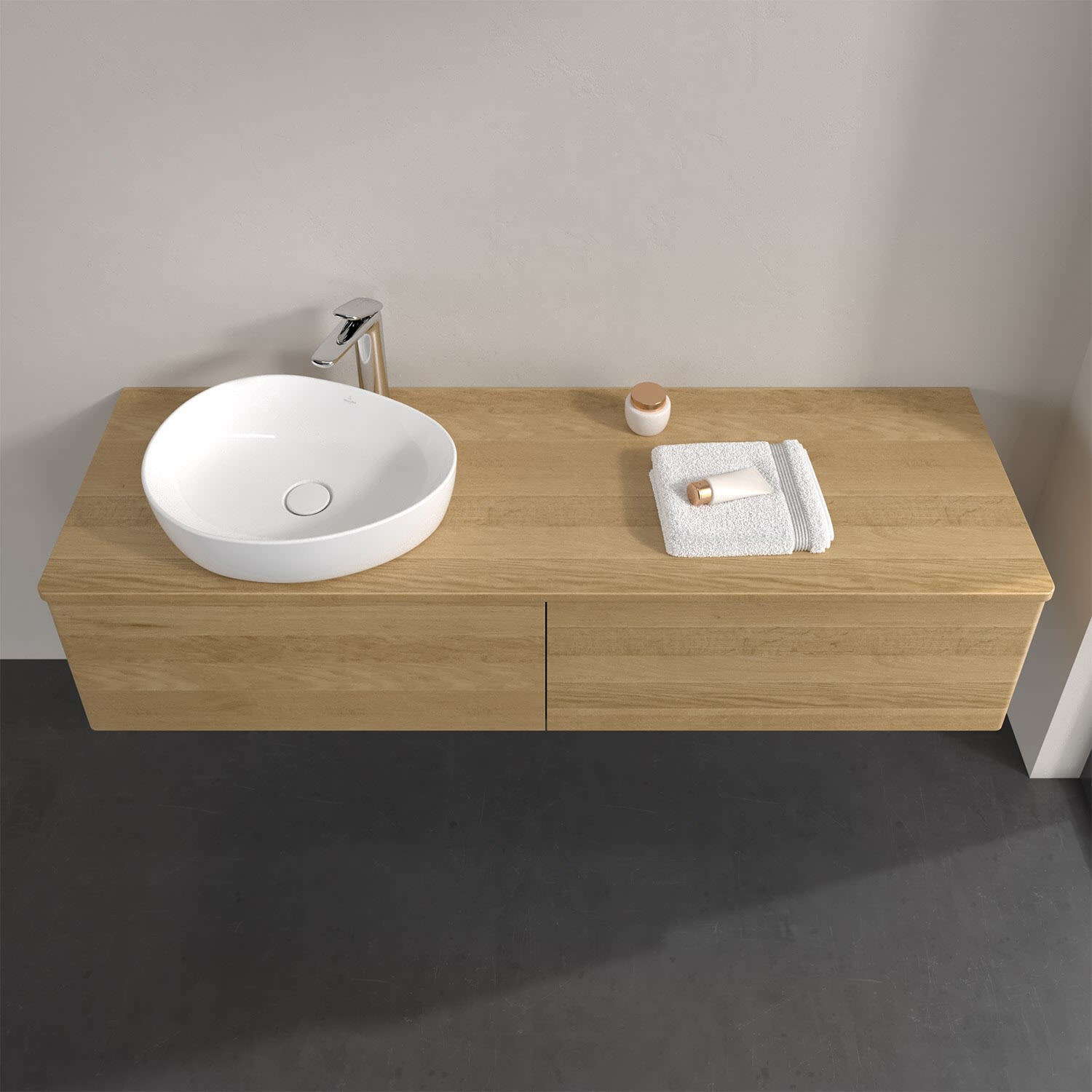 Für diesen Waschbeckenunterschrank stehen Ihnen Aufsatzwaschtische aus verschiedenen Serien zur Verfügung (siehe "Passliste" unter Downloads). Ein ausgewähltes Beispiel finden Sie im Zubehör. Den Waschtisch bitte separat mitbestellen.