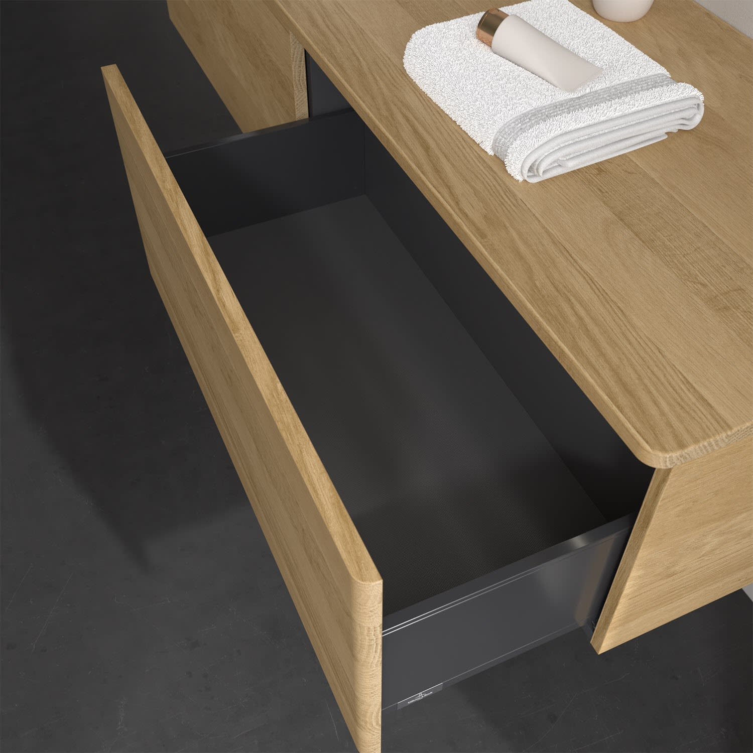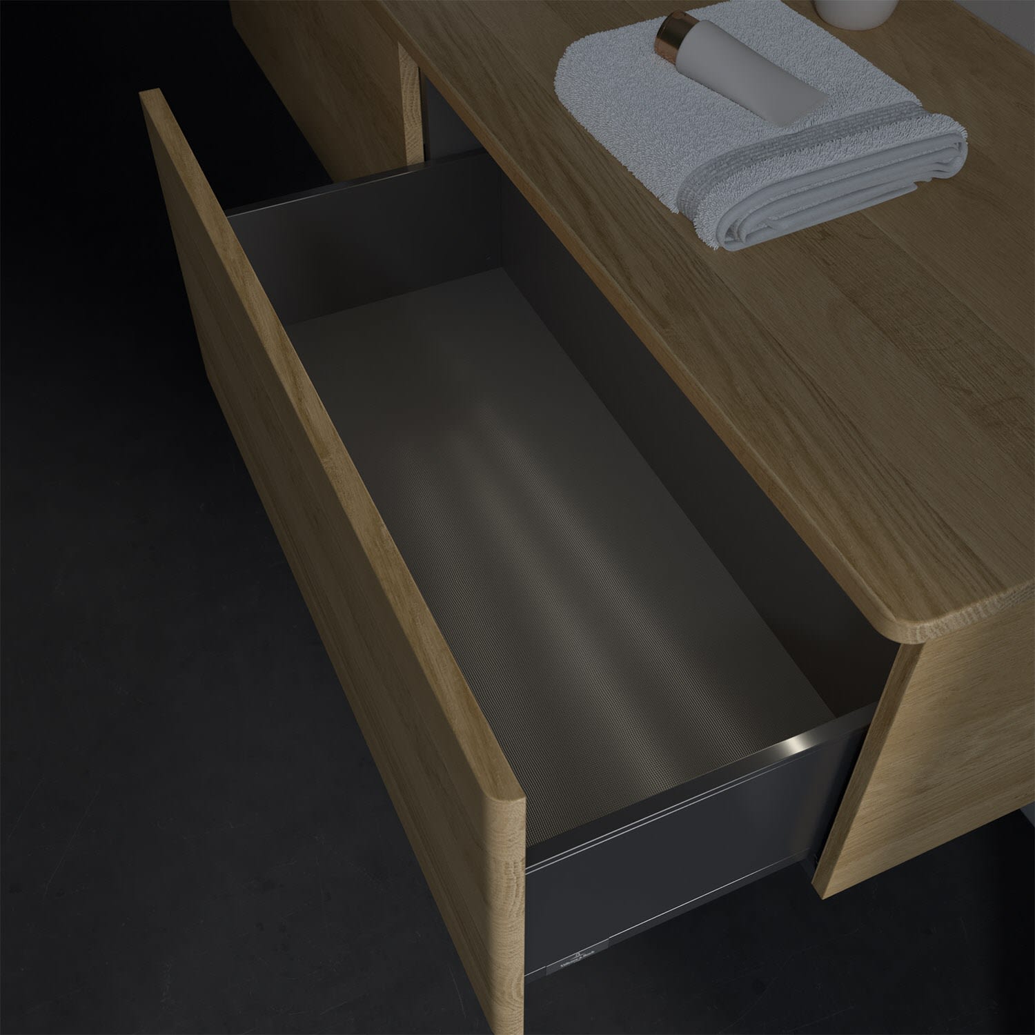 - kein Umfallen oder Verrutschen von Pflegeprodukten in den Schubladen dank rutschhemmendem Boden