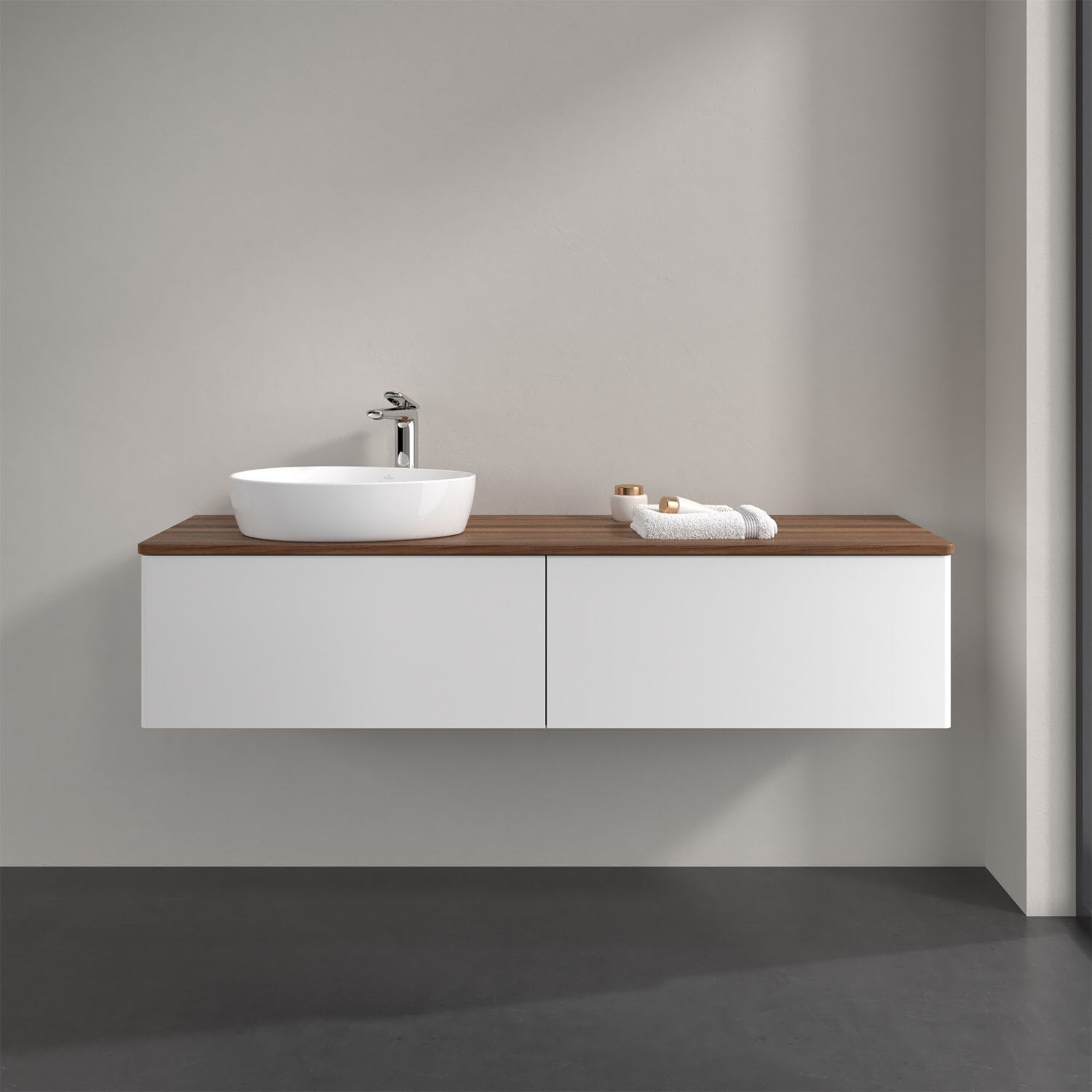 Für diesen Waschbeckenunterschrank stehen Ihnen Aufsatzwaschtische aus verschiedenen Serien zur Verfügung (siehe "Passliste" unter Downloads). Ein ausgewähltes Beispiel finden Sie im Zubehör. Den Waschtisch bitte separat mitbestellen.