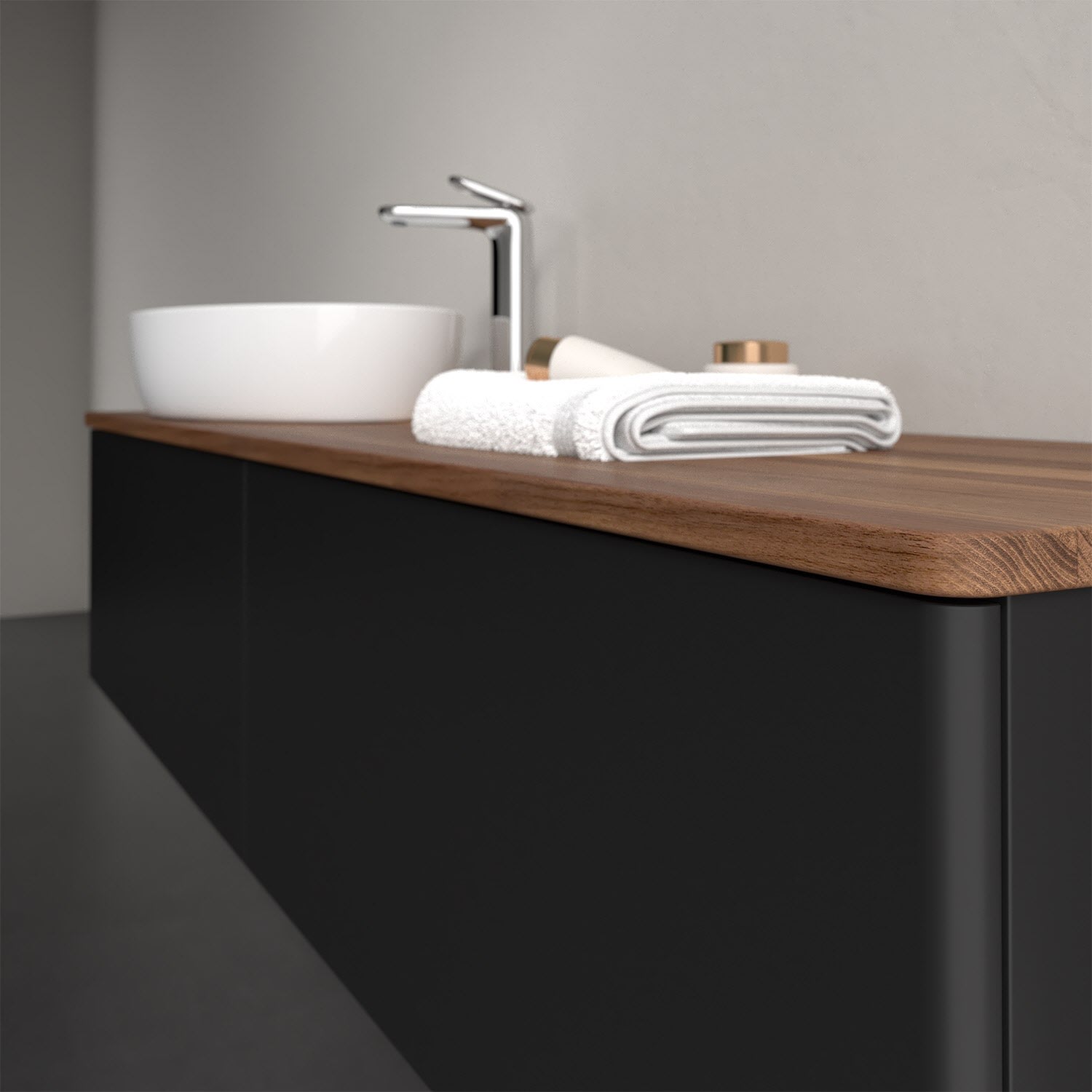 Der wandhängende Antao Waschtischunterschrank bietet mit seinen beiden extra hohen Auszügen und seiner erstaunlichen Größe viel Platz zum Verstauen von Utensilien im Badezimmer. Dank des seitlich platzierten Aufsatzwaschtischs gibt es daneben weiteren Platz für Handtücher, Seifenspender & Co. auf der Waschtischplatte. Inspiriert von der Natur überzeugt der Unterschrank auch optisch mit sanfter Formsprache und abgerundete Kanten. Die grifflosen Auszüge sind mit der Push-to-Open Funktion ausgestattet und verfügen über einen Antirutschboden, damit Utensilien sicher verstaut werden können. Den Überblick behält man dank der warmweißen Auszugsbeleuchtung, die sich automatisch beim Öffnen einschaltet. Mit seiner Vollauszug- und Selbsteinzug-Funktion ist der Schrank praktisch und leicht zu bedienen. Qualität von Villeroy & Boch! Für eine besonders leichte Pflege sorgt die mehrschichtig deckend lackierte Oberfläche. Bei der Ausführung in Massivholz wird dank des verarbeiteten Massivholzes jedes Möbel zu einem Unikat, das sich durch das lebendige Naturmaterial durch seine einzigartige Struktur und Maserung auszeichnet.