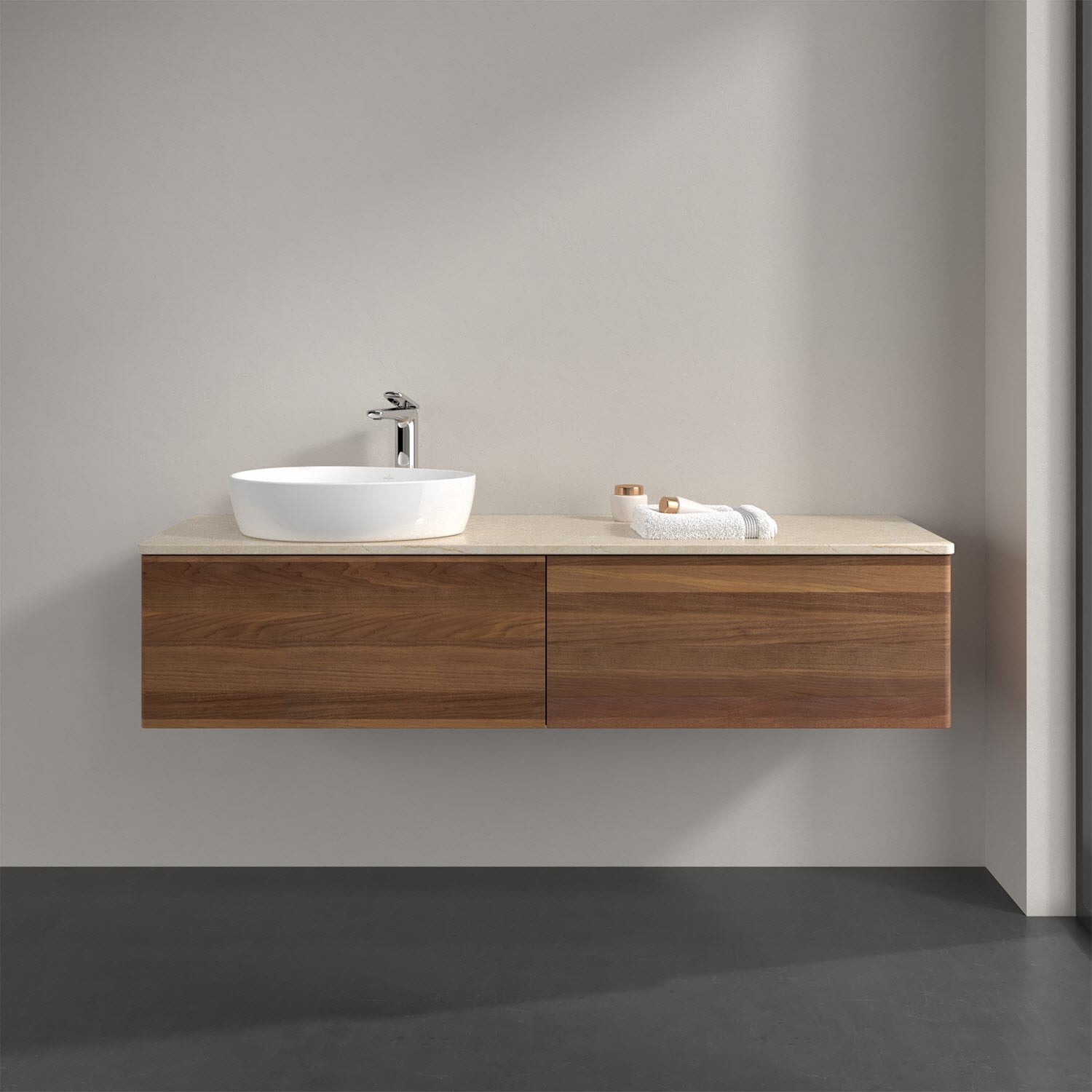 Für diesen Waschbeckenunterschrank stehen Ihnen Aufsatzwaschtische aus verschiedenen Serien zur Verfügung (siehe "Passliste" unter Downloads). Ein ausgewähltes Beispiel finden Sie im Zubehör. Den Waschtisch bitte separat mitbestellen.