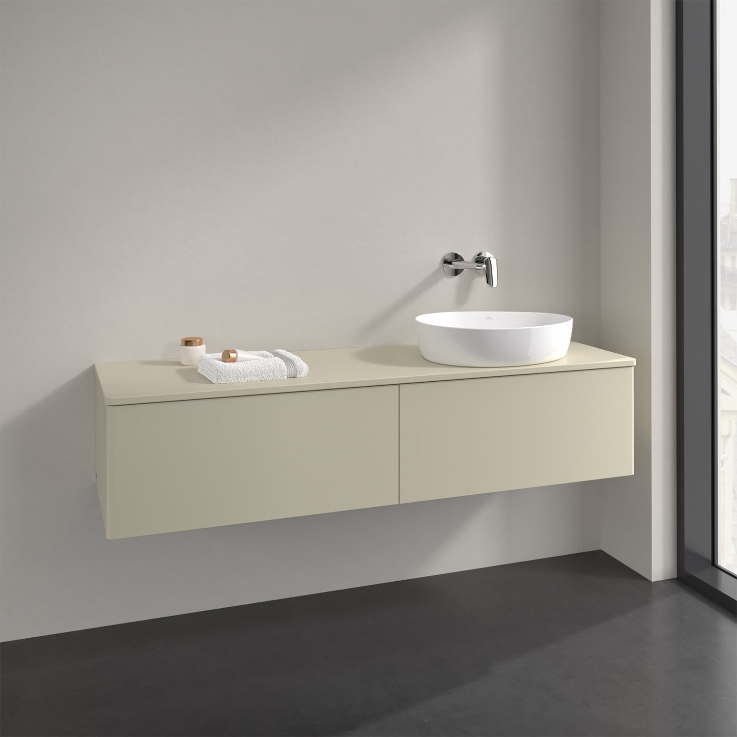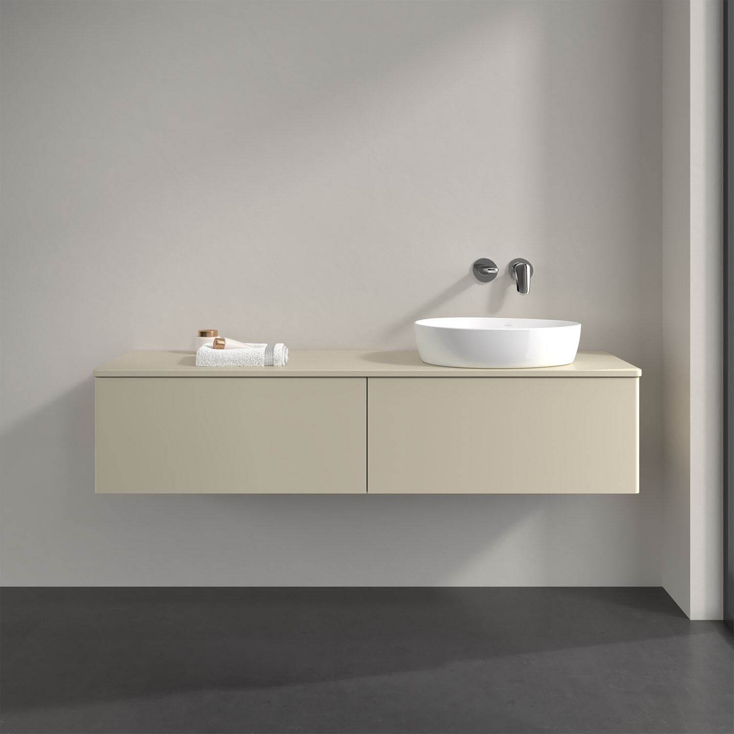 Für diesen Waschbeckenunterschrank stehen Ihnen Aufsatzwaschtische aus verschiedenen Serien zur Verfügung (siehe "Passliste" unter Downloads). Ein ausgewähltes Beispiel finden Sie im Zubehör. Den Waschtisch bitte separat mitbestellen.