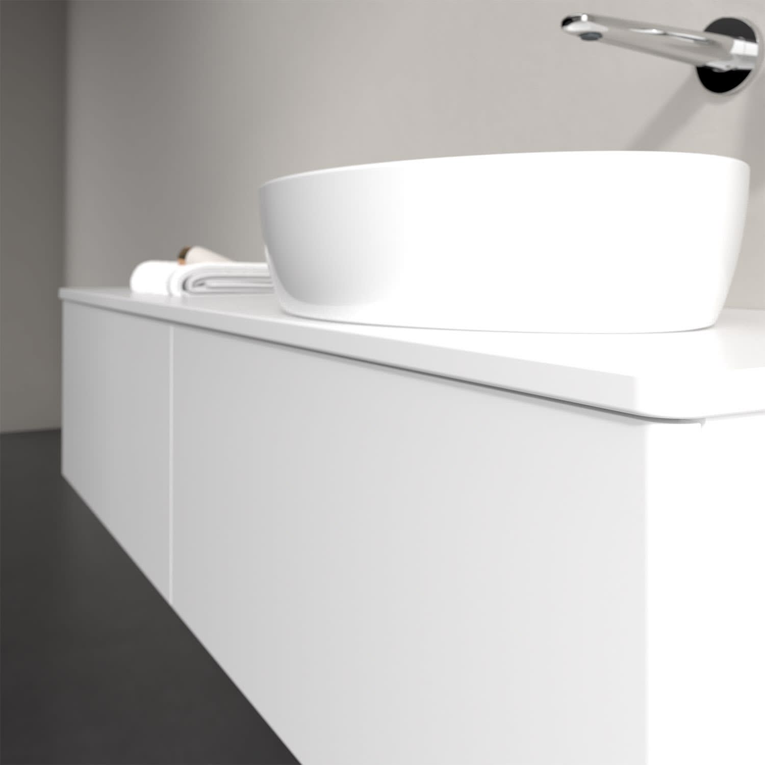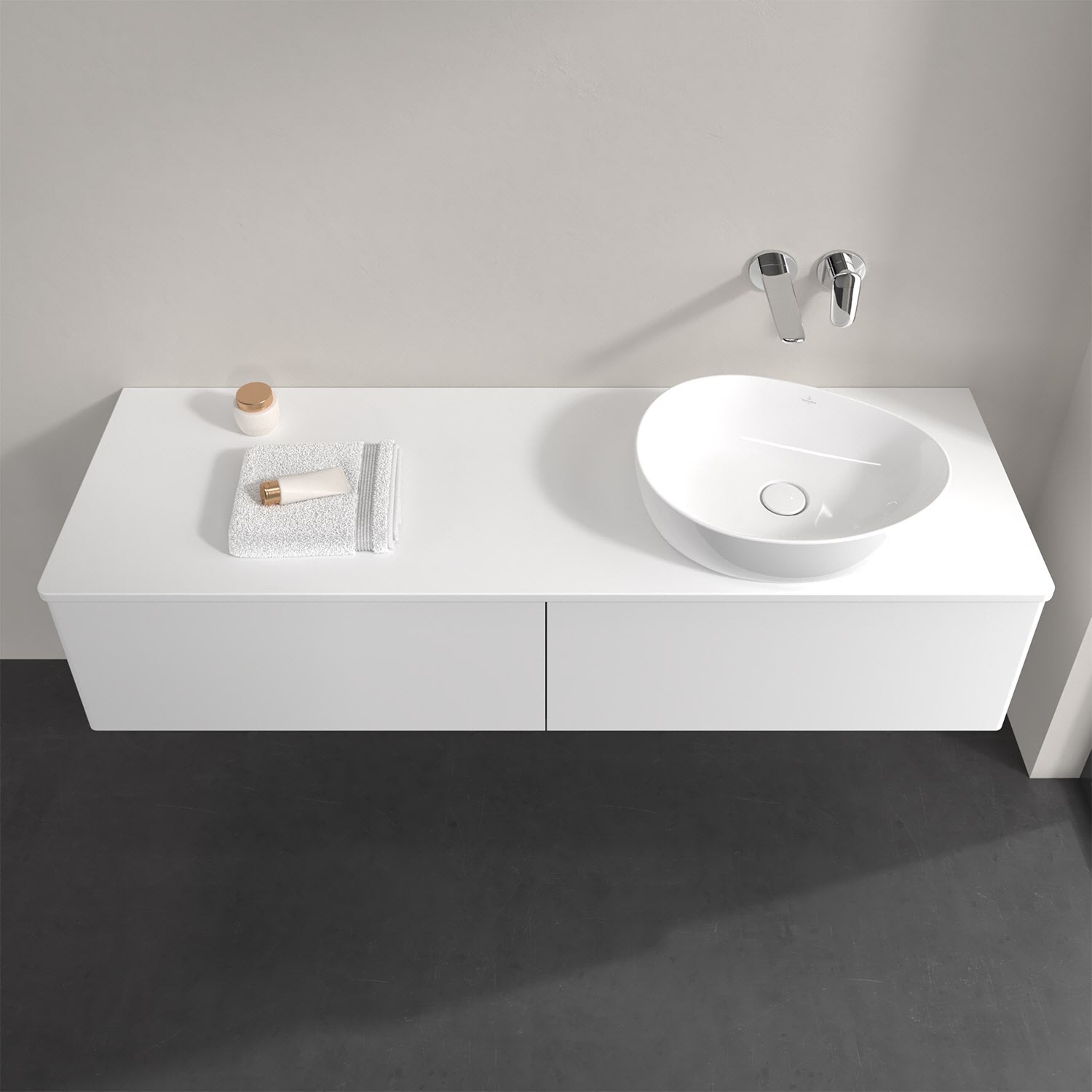 Der wandhängende Antao Waschtischunterschrank bietet mit seinen beiden extra hohen Auszügen und seiner erstaunlichen Größe viel Platz zum Verstauen von Utensilien im Badezimmer. Dank des seitlich platzierten Aufsatzwaschtischs gibt es daneben weiteren Platz für Handtücher, Seifenspender & Co. auf der Waschtischplatte. Inspiriert von der Natur überzeugt der Unterschrank auch optisch mit sanfter Formsprache und abgerundete Kanten. Die grifflosen Auszüge sind mit der Push-to-Open Funktion ausgestattet und verfügen über einen Antirutschboden, damit Utensilien sicher verstaut werden können. Den Überblick behält man dank der warmweißen Auszugsbeleuchtung, die sich automatisch beim Öffnen einschaltet. Mit seiner Vollauszug- und Selbsteinzug-Funktion ist der Schrank praktisch und leicht zu bedienen. Qualität von Villeroy & Boch! Für eine besonders leichte Pflege sorgt die mehrschichtig deckend lackierte Oberfläche.