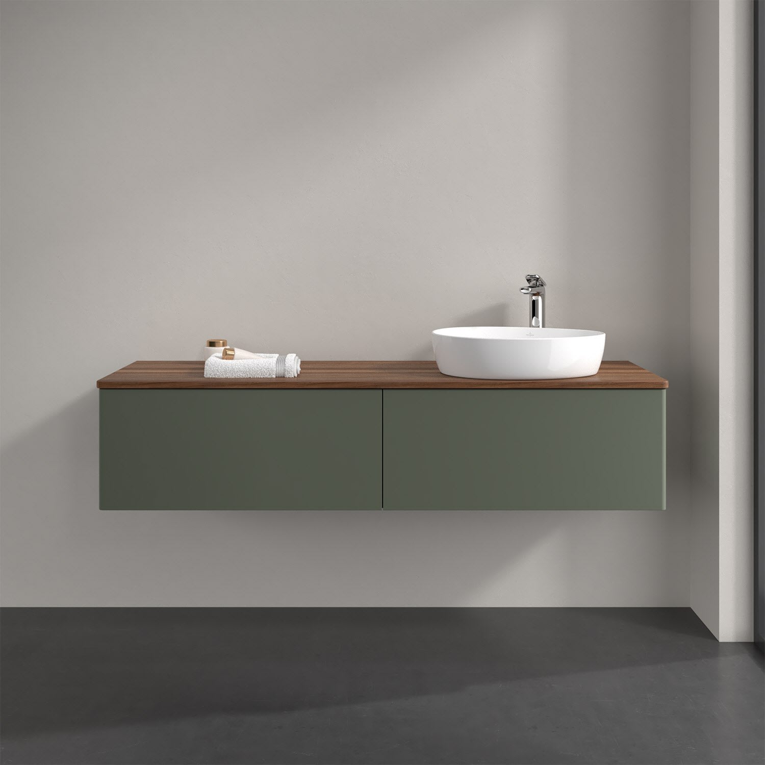 Für diesen Waschbeckenunterschrank stehen Ihnen Aufsatzwaschtische aus verschiedenen Serien zur Verfügung (siehe "Passliste" unter Downloads). Ein ausgewähltes Beispiel finden Sie im Zubehör. Den Waschtisch bitte separat mitbestellen.