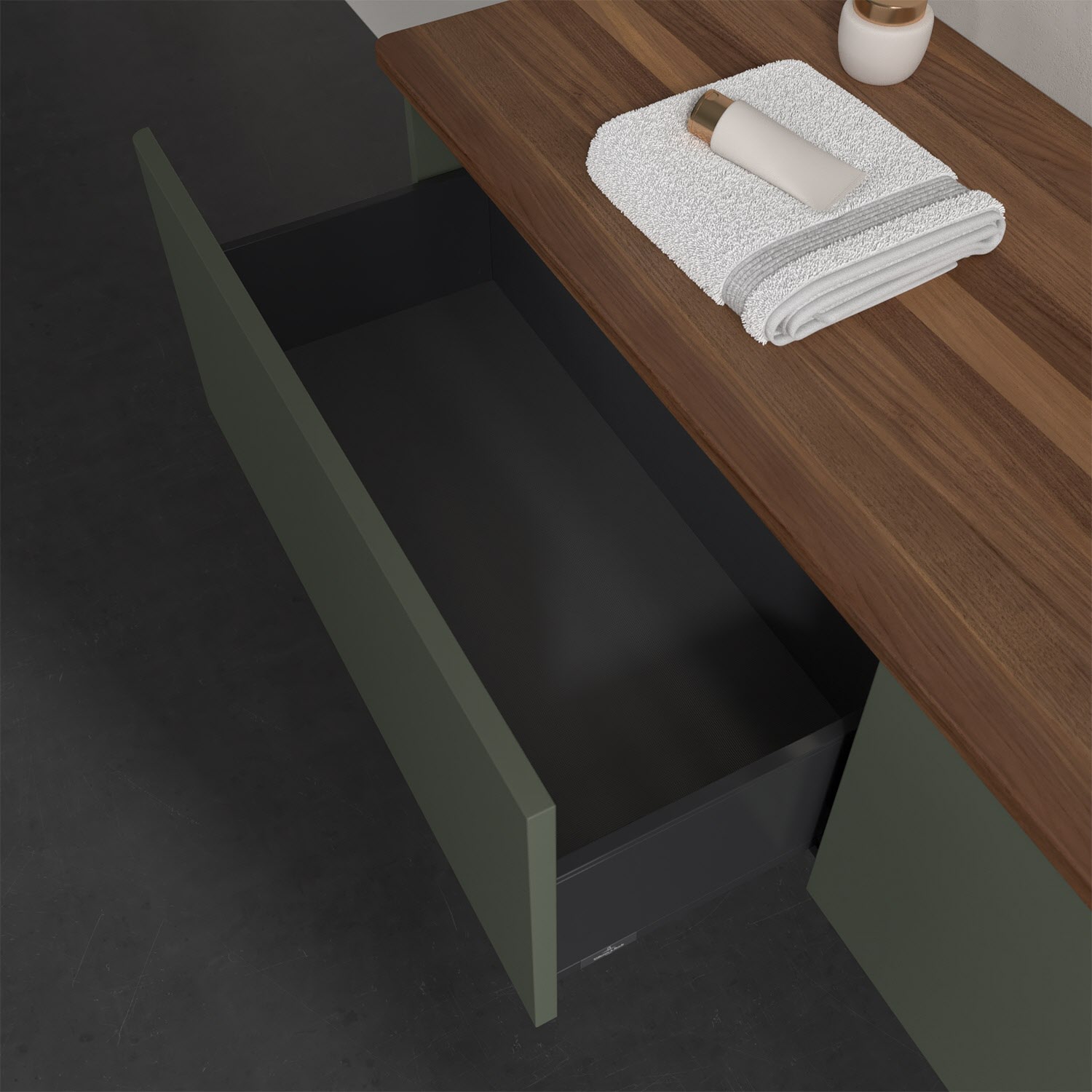 - kein Umfallen oder Verrutschen von Pflegeprodukten in den Schubladen dank rutschhemmendem Boden