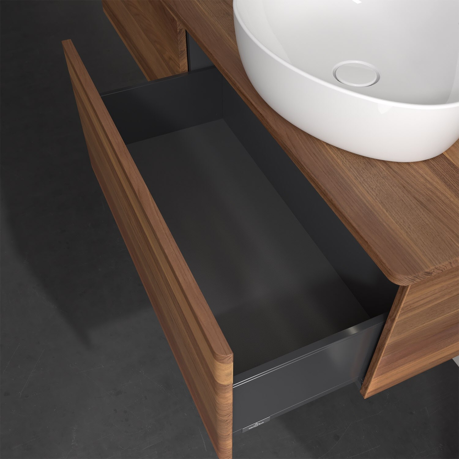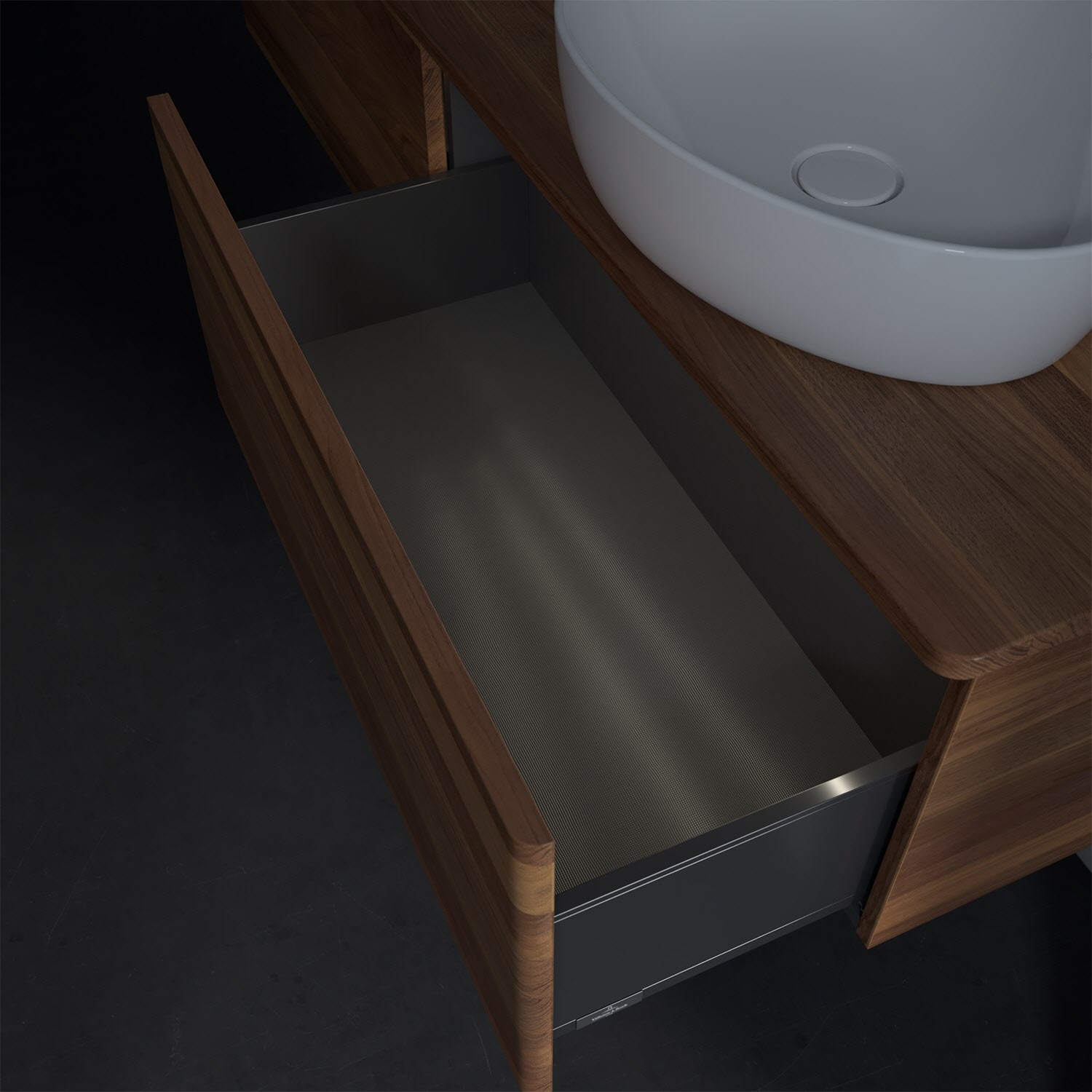 Der wandhängende Antao Waschtischunterschrank bietet mit seinen beiden extra hohen Auszügen und seiner erstaunlichen Größe viel Platz zum Verstauen von Utensilien im Badezimmer. Dank des seitlich platzierten Aufsatzwaschtischs gibt es daneben weiteren Platz für Handtücher, Seifenspender & Co. auf der Waschtischplatte. Inspiriert von der Natur überzeugt der Unterschrank auch optisch mit sanfter Formsprache und abgerundete Kanten. Die grifflosen Auszüge sind mit der Push-to-Open Funktion ausgestattet und verfügen über einen Antirutschboden, damit Utensilien sicher verstaut werden können. Den Überblick behält man dank der warmweißen Auszugsbeleuchtung, die sich automatisch beim Öffnen einschaltet. Mit seiner Vollauszug- und Selbsteinzug-Funktion ist der Schrank praktisch und leicht zu bedienen. Qualität von Villeroy & Boch! Für eine besonders leichte Pflege sorgt die mehrschichtig deckend lackierte Oberfläche. Bei der Ausführung in Massivholz wird dank des verarbeiteten Massivholzes jedes Möbel zu einem Unikat, das sich durch das lebendige Naturmaterial durch seine einzigartige Struktur und Maserung auszeichnet.