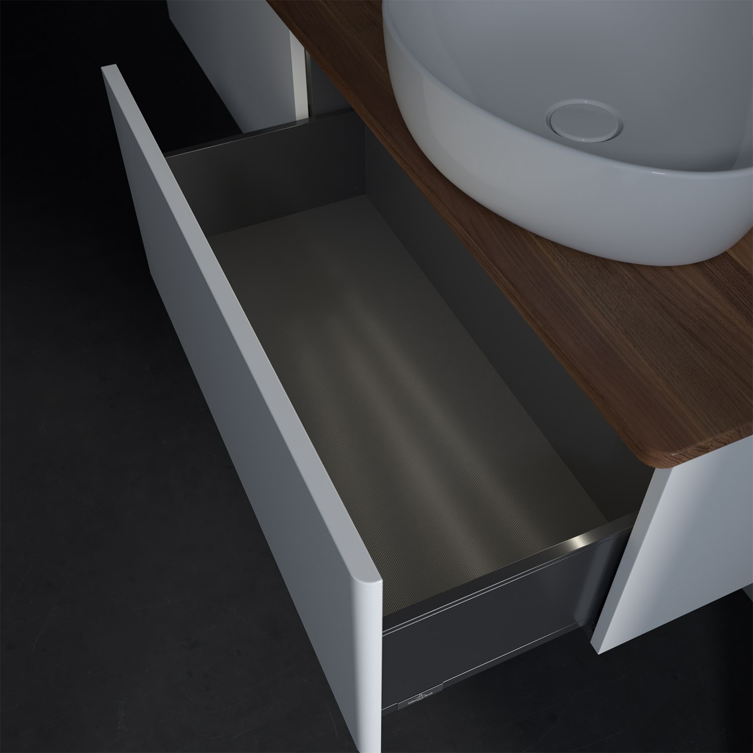 Der wandhängende Antao Waschtischunterschrank bietet mit seinen beiden extra hohen Auszügen und seiner erstaunlichen Größe viel Platz zum Verstauen von Utensilien im Badezimmer. Dank des seitlich platzierten Aufsatzwaschtischs gibt es daneben weiteren Platz für Handtücher, Seifenspender & Co. auf der Waschtischplatte. Inspiriert von der Natur überzeugt der Unterschrank auch optisch mit sanfter Formsprache und abgerundete Kanten. Die grifflosen Auszüge sind mit der Push-to-Open Funktion ausgestattet und verfügen über einen Antirutschboden, damit Utensilien sicher verstaut werden können. Den Überblick behält man dank der warmweißen Auszugsbeleuchtung, die sich automatisch beim Öffnen einschaltet. Mit seiner Vollauszug- und Selbsteinzug-Funktion ist der Schrank praktisch und leicht zu bedienen. Qualität von Villeroy & Boch! Für eine besonders leichte Pflege sorgt die mehrschichtig deckend lackierte Oberfläche. Bei der Ausführung in Massivholz wird dank des verarbeiteten Massivholzes jedes Möbel zu einem Unikat, das sich durch das lebendige Naturmaterial durch seine einzigartige Struktur und Maserung auszeichnet.