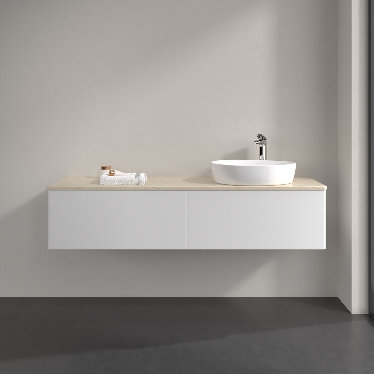 Für diesen Waschbeckenunterschrank stehen Ihnen Aufsatzwaschtische aus verschiedenen Serien zur Verfügung (siehe "Passliste" unter Downloads). Ein ausgewähltes Beispiel finden Sie im Zubehör. Den Waschtisch bitte separat mitbestellen.
