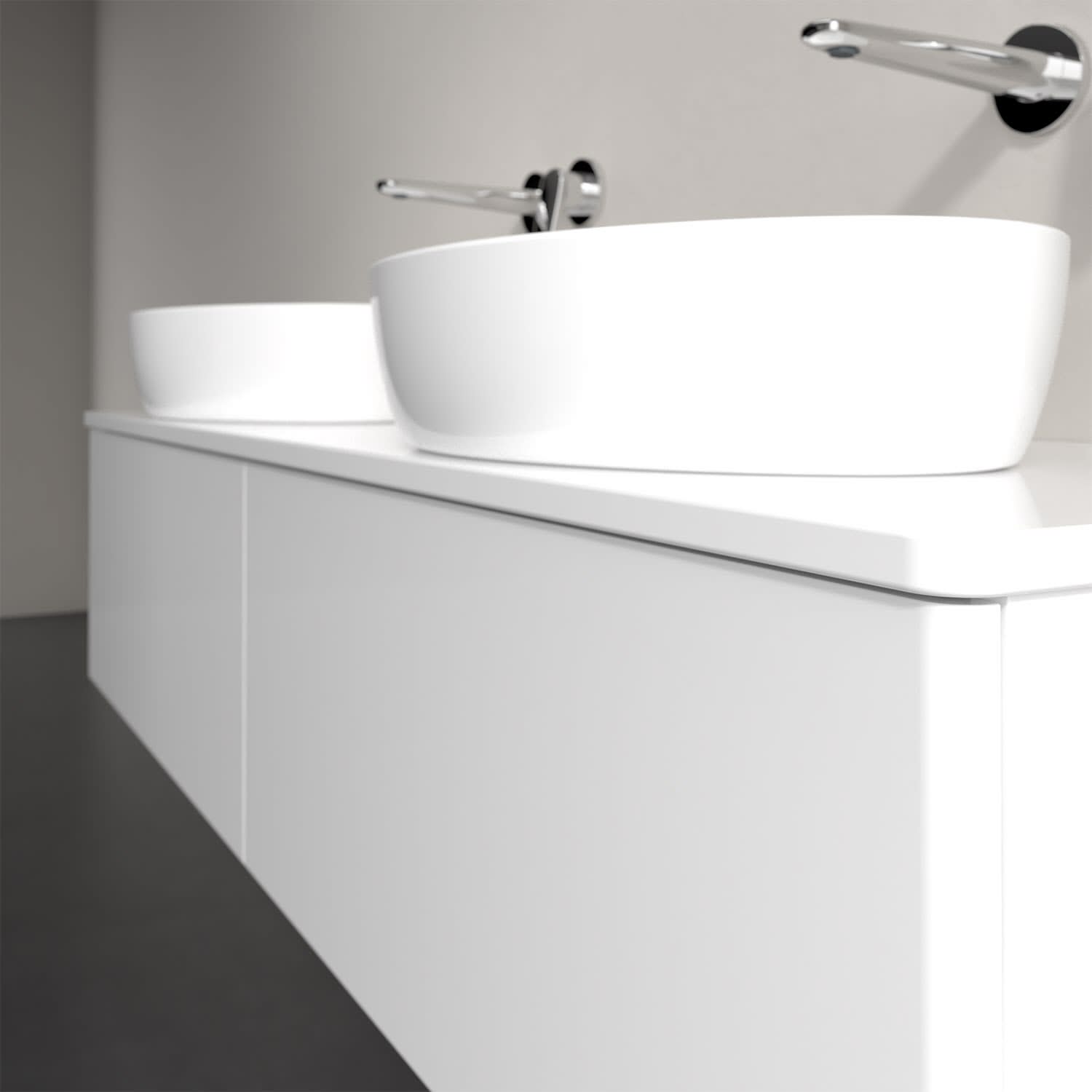 Der wandhängende Antao Waschtischunterschrank für zwei Aufsatzwaschtische bietet mit seinen beiden extra hohen Auszügen und seiner erstaunlichen Größe viel Platz zum Verstauen von Utensilien im Badezimmer. Inspiriert von der Natur überzeugt der Unterschrank auch optisch mit sanfter Formsprache und abgerundete Kanten. Die grifflosen Auszüge sind mit der Push-to-Open Funktion ausgestattet und verfügen über einen Antirutschboden, damit Utensilien sicher verstaut werden können. Den Überblick behält man dank der warmweißen Auszugsbeleuchtung, die sich automatisch beim Öffnen einschaltet. Mit seiner Vollauszug- und Selbsteinzug-Funktion ist der Schrank praktisch und leicht zu bedienen. Qualität von Villeroy & Boch! Für eine besonders leichte Pflege sorgt die mehrschichtig deckend lackierte Oberfläche.
