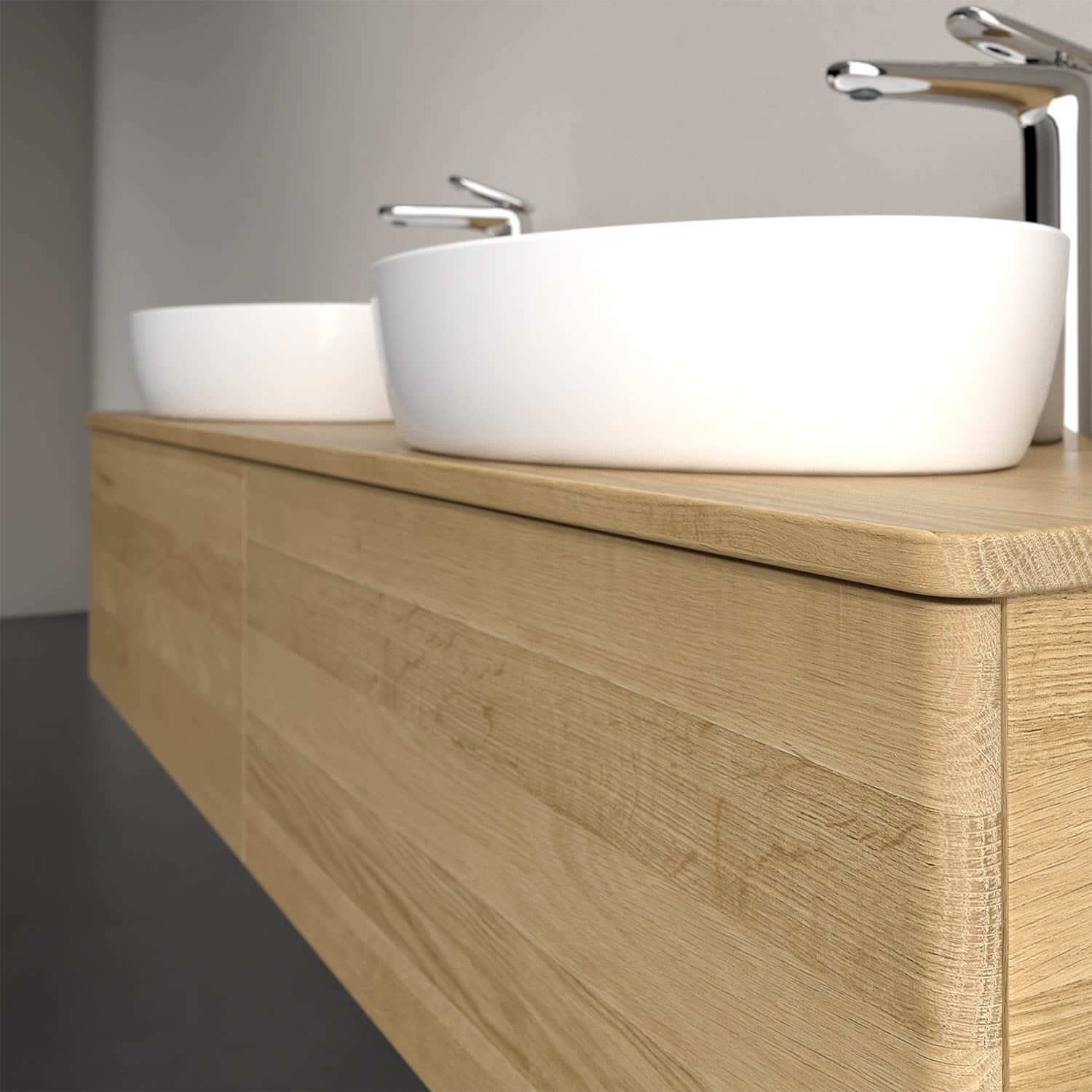 Der wandhängende Antao Waschtischunterschrank für zwei Aufsatzwaschtische bietet mit seinen beiden extra hohen Auszügen und seiner erstaunlichen Größe viel Platz zum Verstauen von Utensilien im Badezimmer. Inspiriert von der Natur überzeugt der Unterschrank auch optisch mit sanfter Formsprache und abgerundete Kanten. Die grifflosen Auszüge sind mit der Push-to-Open Funktion ausgestattet und verfügen über einen Antirutschboden, damit Utensilien sicher verstaut werden können. Den Überblick behält man dank der warmweißen Auszugsbeleuchtung, die sich automatisch beim Öffnen einschaltet. Mit seiner Vollauszug- und Selbsteinzug-Funktion ist der Schrank praktisch und leicht zu bedienen. Qualität von Villeroy & Boch! Für eine besonders leichte Pflege sorgt die mehrschichtig deckend lackierte Oberfläche. Bei der Ausführung in Massivholz wird dank des verarbeiteten Massivholzes jedes Möbel zu einem Unikat, das sich durch das lebendige Naturmaterial durch seine einzigartige Struktur und Maserung auszeichnet.