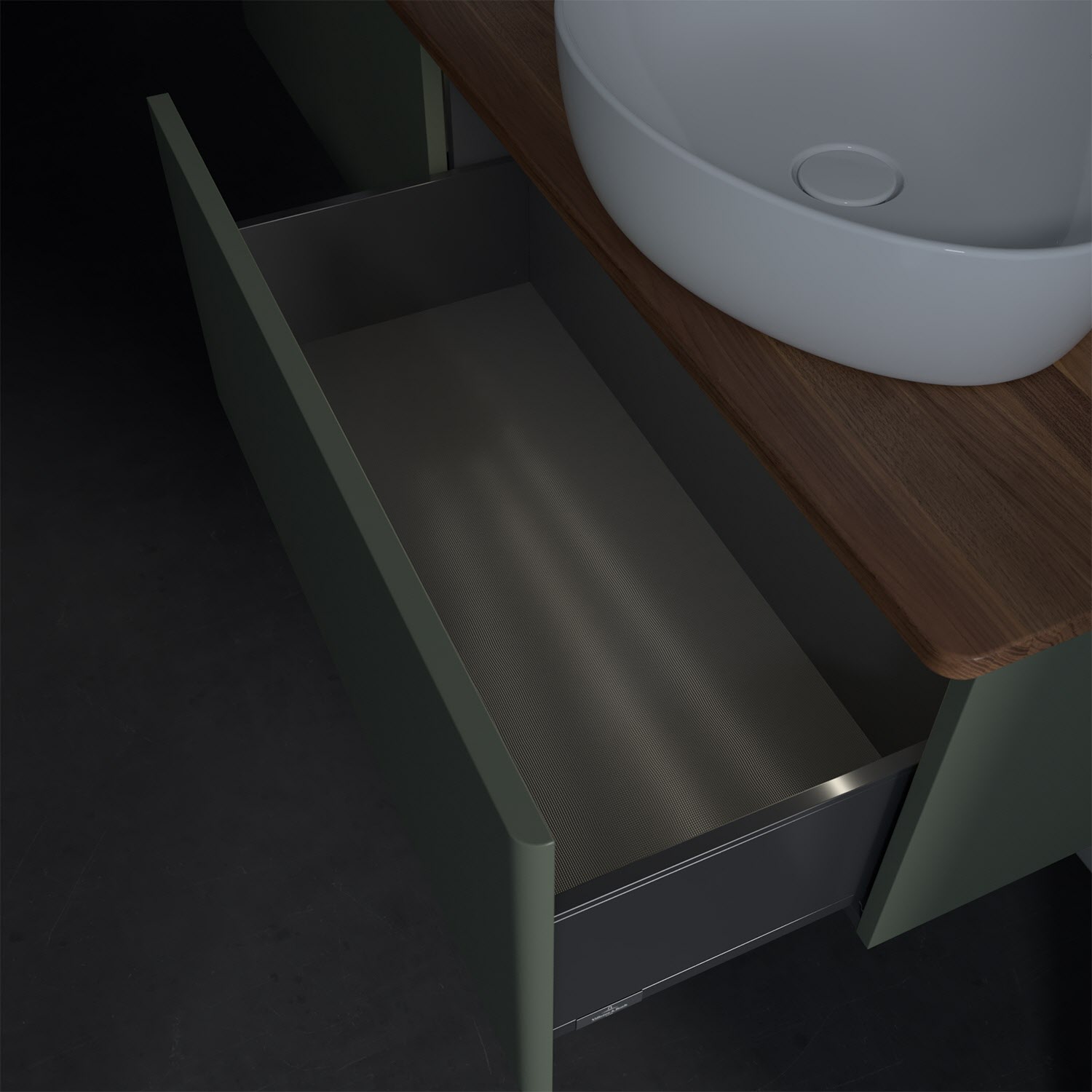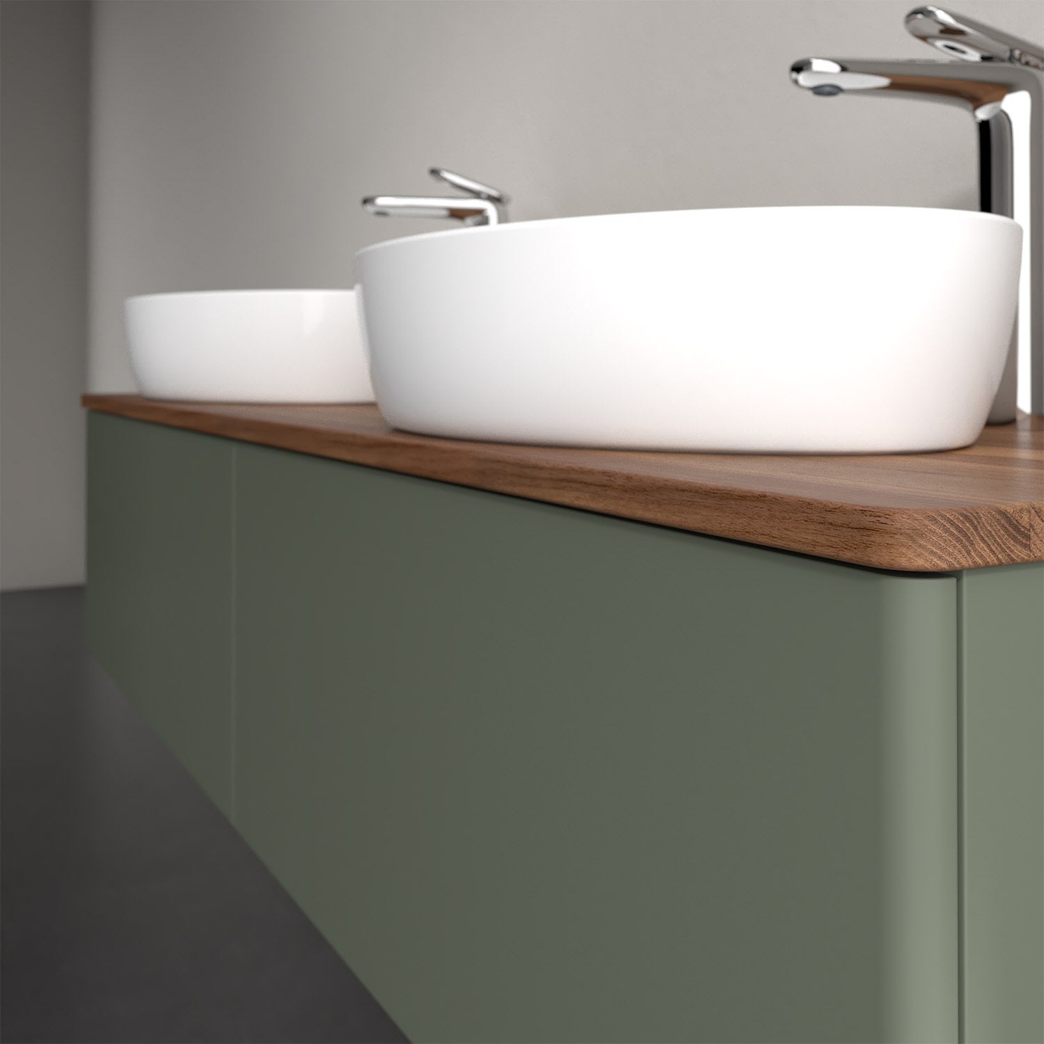 Der wandhängende Antao Waschtischunterschrank für zwei Aufsatzwaschtische bietet mit seinen beiden extra hohen Auszügen und seiner erstaunlichen Größe viel Platz zum Verstauen von Utensilien im Badezimmer. Inspiriert von der Natur überzeugt der Unterschrank auch optisch mit sanfter Formsprache und abgerundete Kanten. Die grifflosen Auszüge sind mit der Push-to-Open Funktion ausgestattet und verfügen über einen Antirutschboden, damit Utensilien sicher verstaut werden können. Den Überblick behält man dank der warmweißen Auszugsbeleuchtung, die sich automatisch beim Öffnen einschaltet. Mit seiner Vollauszug- und Selbsteinzug-Funktion ist der Schrank praktisch und leicht zu bedienen. Qualität von Villeroy & Boch! Für eine besonders leichte Pflege sorgt die mehrschichtig deckend lackierte Oberfläche. Bei der Ausführung in Massivholz wird dank des verarbeiteten Massivholzes jedes Möbel zu einem Unikat, das sich durch das lebendige Naturmaterial durch seine einzigartige Struktur und Maserung auszeichnet.