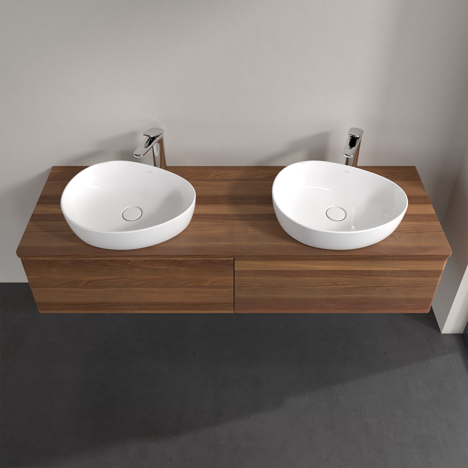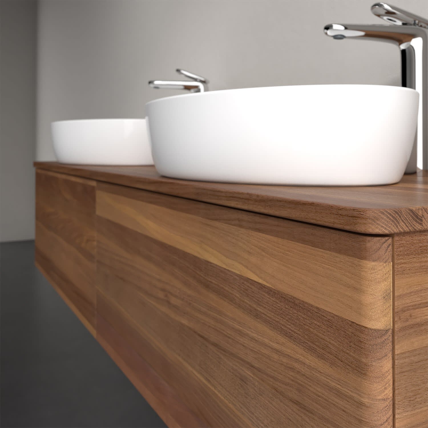 Der wandhängende Antao Waschtischunterschrank für zwei Aufsatzwaschtische bietet mit seinen beiden extra hohen Auszügen und seiner erstaunlichen Größe viel Platz zum Verstauen von Utensilien im Badezimmer. Inspiriert von der Natur überzeugt der Unterschrank auch optisch mit sanfter Formsprache und abgerundete Kanten. Die grifflosen Auszüge sind mit der Push-to-Open Funktion ausgestattet und verfügen über einen Antirutschboden, damit Utensilien sicher verstaut werden können. Den Überblick behält man dank der warmweißen Auszugsbeleuchtung, die sich automatisch beim Öffnen einschaltet. Mit seiner Vollauszug- und Selbsteinzug-Funktion ist der Schrank praktisch und leicht zu bedienen. Qualität von Villeroy & Boch! Für eine besonders leichte Pflege sorgt die mehrschichtig deckend lackierte Oberfläche. Bei der Ausführung in Massivholz wird dank des verarbeiteten Massivholzes jedes Möbel zu einem Unikat, das sich durch das lebendige Naturmaterial durch seine einzigartige Struktur und Maserung auszeichnet.