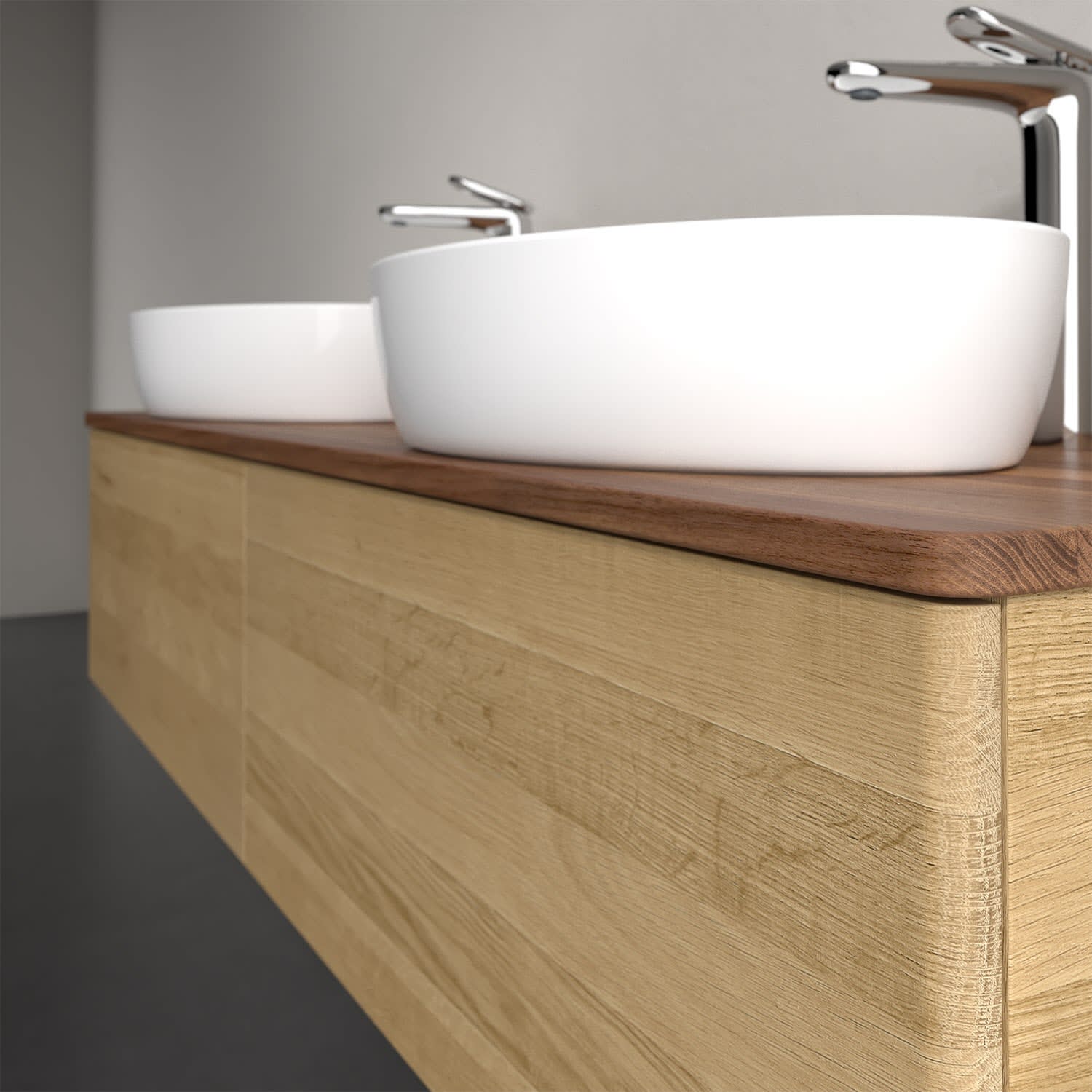 Der wandhängende Antao Waschtischunterschrank für zwei Aufsatzwaschtische bietet mit seinen beiden extra hohen Auszügen und seiner erstaunlichen Größe viel Platz zum Verstauen von Utensilien im Badezimmer. Inspiriert von der Natur überzeugt der Unterschrank auch optisch mit sanfter Formsprache und abgerundete Kanten. Die grifflosen Auszüge sind mit der Push-to-Open Funktion ausgestattet und verfügen über einen Antirutschboden, damit Utensilien sicher verstaut werden können. Den Überblick behält man dank der warmweißen Auszugsbeleuchtung, die sich automatisch beim Öffnen einschaltet. Mit seiner Vollauszug- und Selbsteinzug-Funktion ist der Schrank praktisch und leicht zu bedienen. Qualität von Villeroy & Boch! Für eine besonders leichte Pflege sorgt die mehrschichtig deckend lackierte Oberfläche. Bei der Ausführung in Massivholz wird dank des verarbeiteten Massivholzes jedes Möbel zu einem Unikat, das sich durch das lebendige Naturmaterial durch seine einzigartige Struktur und Maserung auszeichnet.