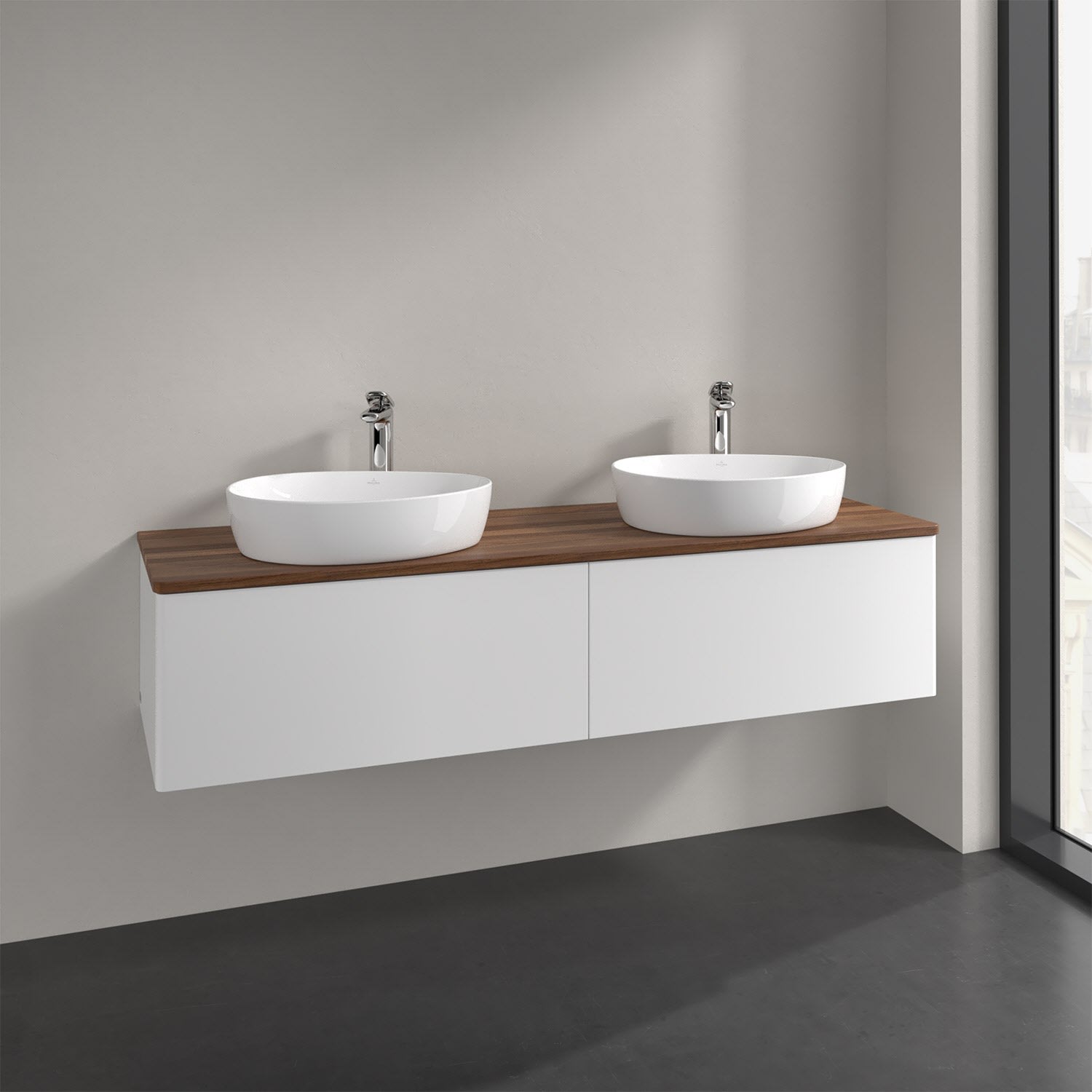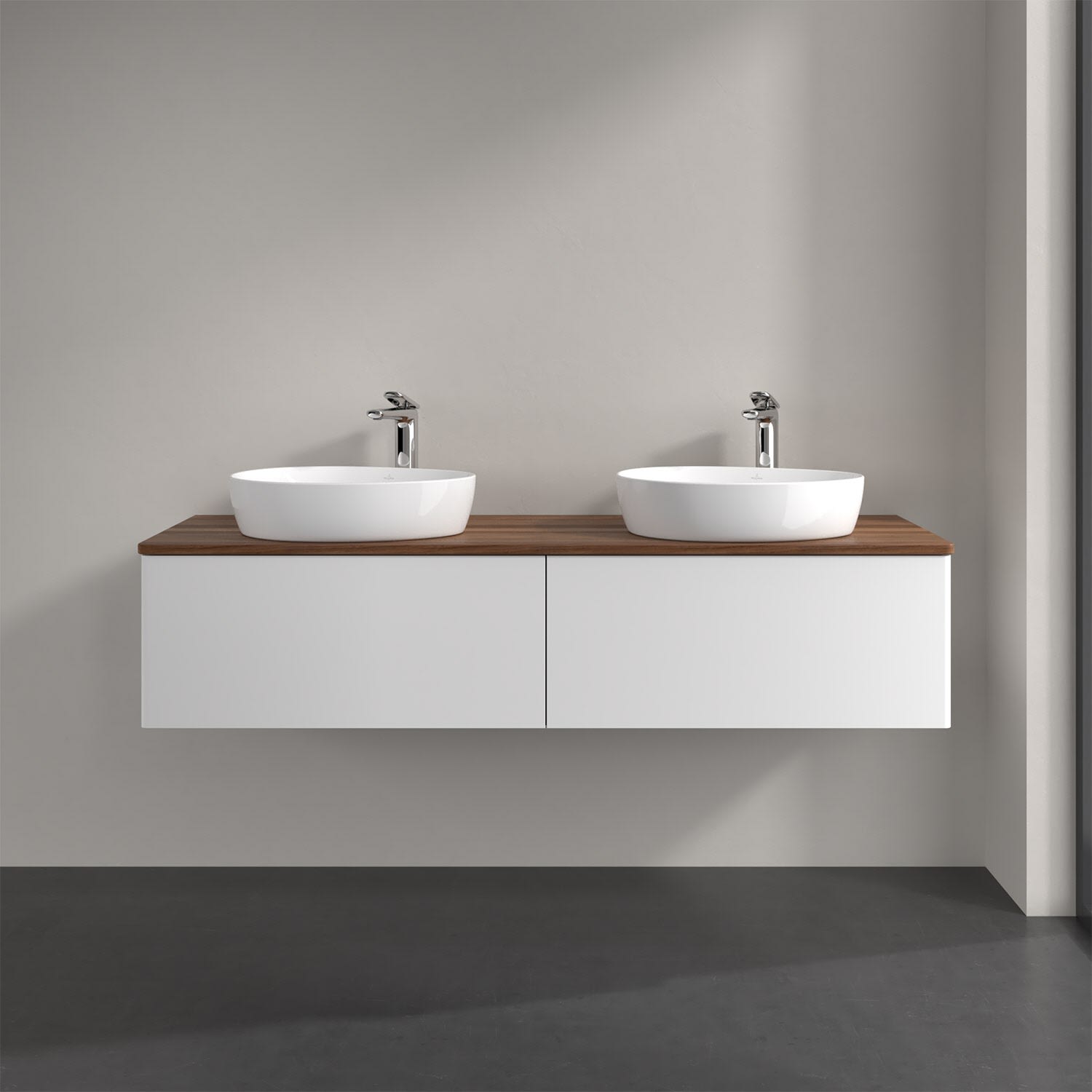 Der wandhängende Antao Waschtischunterschrank für zwei Aufsatzwaschtische bietet mit seinen beiden extra hohen Auszügen und seiner erstaunlichen Größe viel Platz zum Verstauen von Utensilien im Badezimmer. Inspiriert von der Natur überzeugt der Unterschrank auch optisch mit sanfter Formsprache und abgerundete Kanten. Die grifflosen Auszüge sind mit der Push-to-Open Funktion ausgestattet und verfügen über einen Antirutschboden, damit Utensilien sicher verstaut werden können. Den Überblick behält man dank der warmweißen Auszugsbeleuchtung, die sich automatisch beim Öffnen einschaltet. Mit seiner Vollauszug- und Selbsteinzug-Funktion ist der Schrank praktisch und leicht zu bedienen. Qualität von Villeroy & Boch! Für eine besonders leichte Pflege sorgt die mehrschichtig deckend lackierte Oberfläche. Bei der Ausführung in Massivholz wird dank des verarbeiteten Massivholzes jedes Möbel zu einem Unikat, das sich durch das lebendige Naturmaterial durch seine einzigartige Struktur und Maserung auszeichnet.