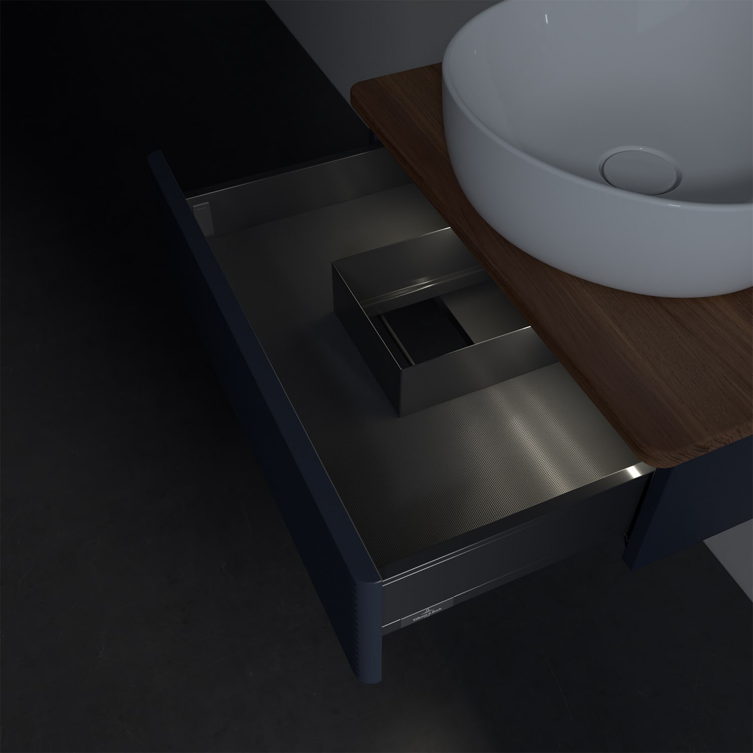 Wenig Platz im Badezimmer und dennoch soll es gemütlich und ordentlich sein? Dann ist der wandhängende Antao Waschtischunterschrank mit seinen sanft abgerundeten Kanten die ideale Lösung. Das geräumige Möbel bietet ausreichend Stauraum für alle nötigen Badutensilien. Zum Öffnen genügt dank der Push-to-Open Funktion ein leichter Druck auf den grifflosen Auszug mit strukturierter Front, der sich dann in seiner vollen Tiefe öffnet. Dabei wird gleichzeitig die angenehme Auszugsbeleuchtung in Warmweiß aktiviert. Das garantiert den benötigen Überblick! Praktisch ist auch der integrierte Antirutschboden und die SoftClosing Funktion, die ein Umfallen oder Verrutschen der verstauten Produkte verhindern. Villeroy & Boch hat alles durchdacht! Für eine besonders leichte Pflege sorgt die mehrschichtig deckend lackierte Oberfläche. Bei der Ausführung in Massivholz wird dank des verarbeiteten Massivholzes jedes Möbel zu einem Unikat, das sich durch das lebendige Naturmaterial durch seine einzigartige Struktur und Maserung auszeichnet.