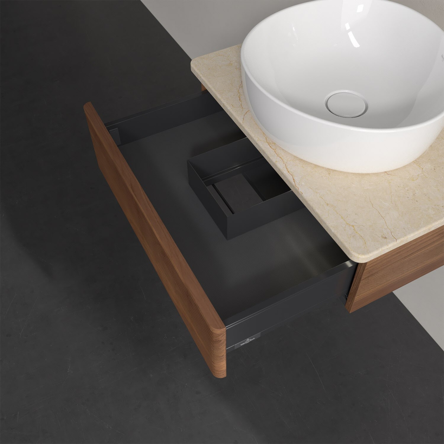 Für diesen Waschbeckenunterschrank stehen Ihnen Aufsatzwaschtische aus verschiedenen Serien zur Verfügung (siehe "Passliste" unter Downloads). Ein ausgewähltes Beispiel finden Sie im Zubehör. Den Waschtisch bitte separat mitbestellen.
