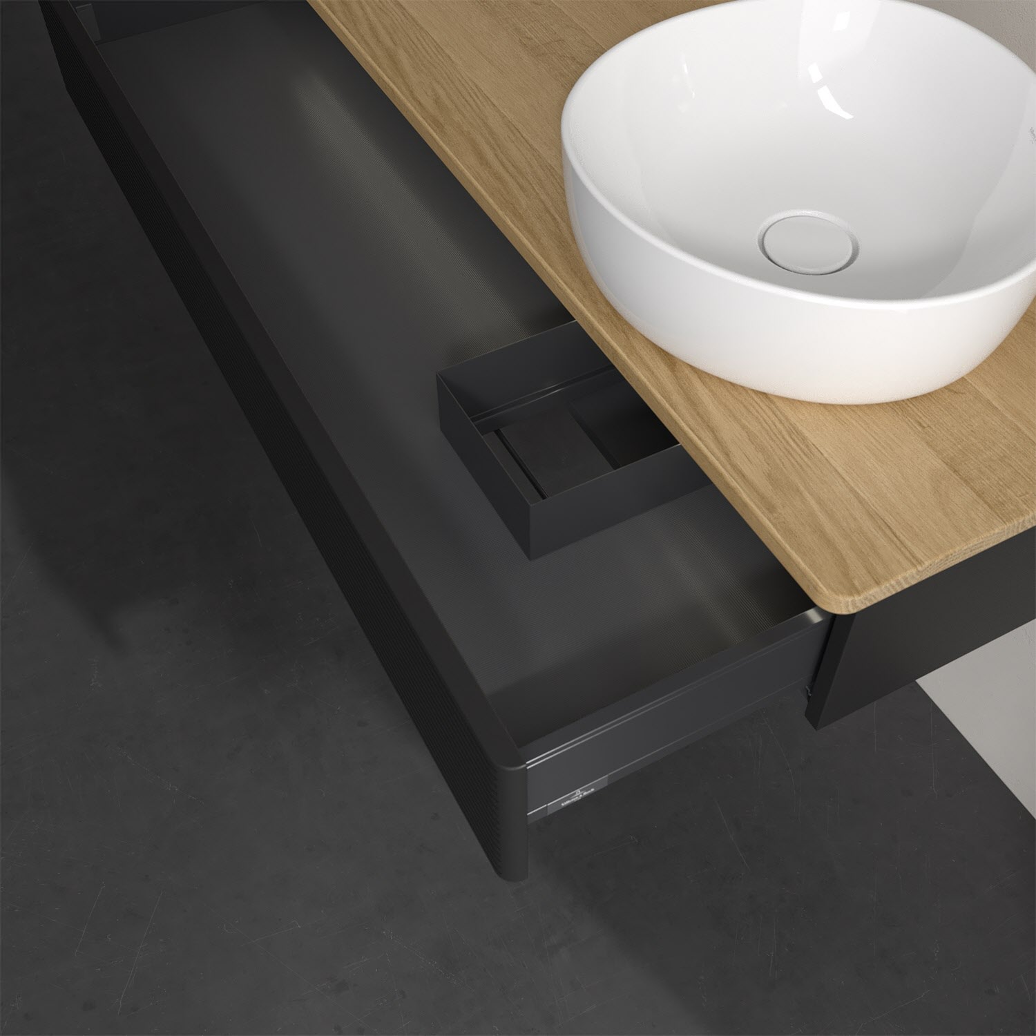 Der wandhängende Antao Waschtischunterschrank von Villeroy & Boch bietet nicht nur jede Menge Stauraum – er ist dank seines naturinspirierten Designs mit seinen abgerundeten Kanten auch noch besonders stilvoll und schafft eine gemütliche Atmosphäre im Badezimmer. Auf der Waschtischplatte bietet sich seitlich des Waschtischs viel Platz für Zahnbürstenbecher oder Seifenspender. Der geräumige Auszug bietet viel Platz, um alles Notwendige zu verstauen und Ordnung zu halten. Öffnen lässt er sich durch leichten Druck auf die strukturierte Front. Dabei aktiviert sich übrigens die Auszugsbeleuchtung in angenehmem Warmweiß. Dank Vollauszug hat man immer alles im Blick und der Antirutschboden verhindert ein Umfallen oder Verrutschen der Gegenstände. Einfach clever! Für eine besonders leichte Pflege sorgt die mehrschichtig deckend lackierte Oberfläche. Bei der Ausführung in Massivholz wird dank des verarbeiteten Massivholzes jedes Möbel zu einem Unikat, das sich durch das lebendige Naturmaterial durch seine einzigartige Struktur und Maserung auszeichnet.