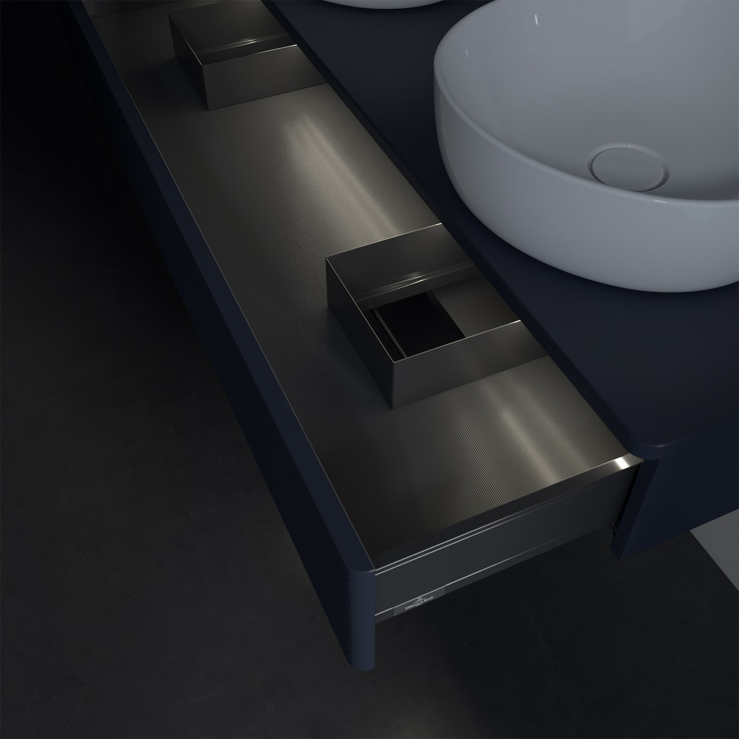 Der wandhängende Antao Waschtischunterschrank von Villeroy & Boch bietet nicht nur jede Menge Stauraum – er ist dank seines naturinspirierten Designs mit seinen abgerundeten Kanten auch noch besonders stilvoll und schafft eine gemütliche Atmosphäre im Badezimmer. Kombiniert mit zwei passenden Aufsatzwaschtischen also die ideale Wahl. Der geräumige Auszug bietet viel Platz, um alles Notwendige zu verstauen und Ordnung zu halten. Öffnen lässt er sich durch leichten Druck auf die strukturierte Front. Dabei aktiviert sich übrigens die Auszugsbeleuchtung in angenehmem Warmweiß. Dank Vollauszug hat man immer alles im Blick und der Antirutschboden verhindert ein Umfallen oder Verrutschen der Gegenstände. Einfach clever! Für eine besonders leichte Pflege sorgt die mehrschichtig deckend lackierte Oberfläche.