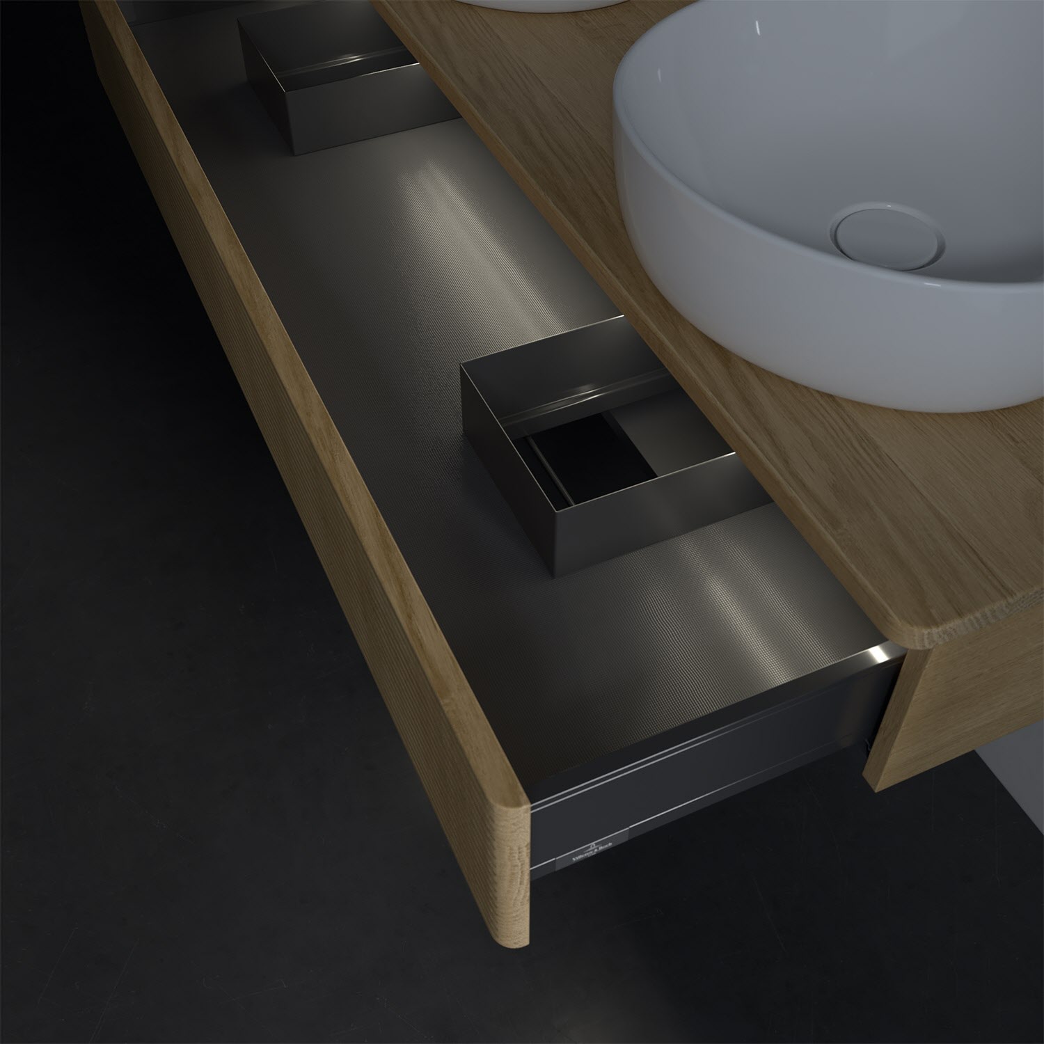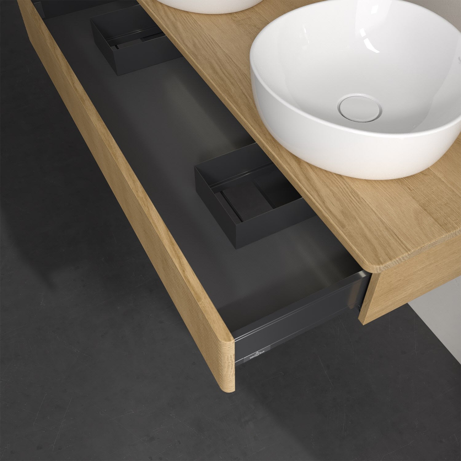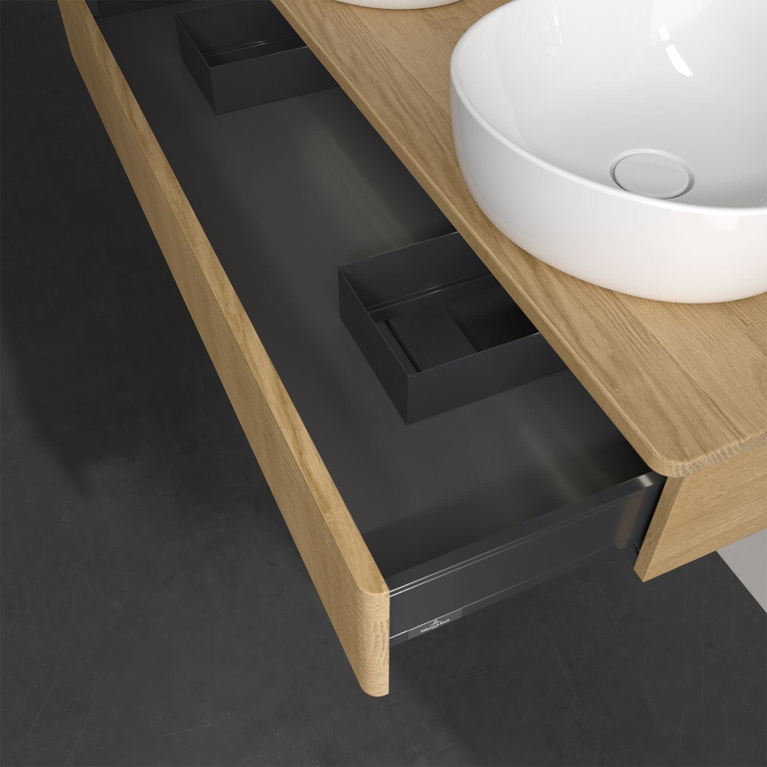 Der wandhängende Antao Waschtischunterschrank von Villeroy & Boch bietet nicht nur jede Menge Stauraum – er ist dank seines naturinspirierten Designs mit seinen abgerundeten Kanten auch noch besonders stilvoll und schafft eine gemütliche Atmosphäre im Badezimmer. Kombiniert mit zwei passenden Aufsatzwaschtischen also die ideale Wahl. Der geräumige Auszug bietet viel Platz, um alles Notwendige zu verstauen und Ordnung zu halten. Öffnen lässt er sich durch leichten Druck auf die strukturierte Front. Dabei aktiviert sich übrigens die Auszugsbeleuchtung in angenehmem Warmweiß. Dank Vollauszug hat man immer alles im Blick und der Antirutschboden verhindert ein Umfallen oder Verrutschen der Gegenstände. Einfach clever! Für eine besonders leichte Pflege sorgt die mehrschichtig deckend lackierte Oberfläche. Bei der Ausführung in Massivholz wird dank des verarbeiteten Massivholzes jedes Möbel zu einem Unikat, das sich durch das lebendige Naturmaterial durch seine einzigartige Struktur und Maserung auszeichnet.