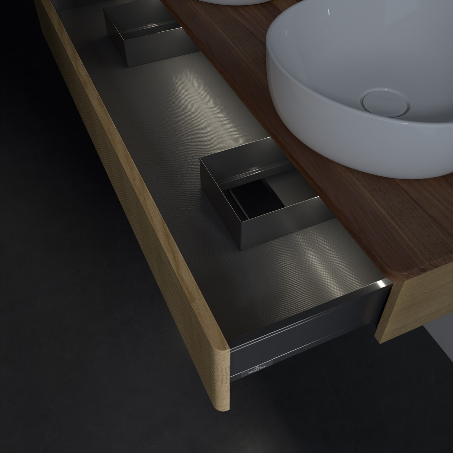 Der wandhängende Antao Waschtischunterschrank von Villeroy & Boch bietet nicht nur jede Menge Stauraum – er ist dank seines naturinspirierten Designs mit seinen abgerundeten Kanten auch noch besonders stilvoll und schafft eine gemütliche Atmosphäre im Badezimmer. Kombiniert mit zwei passenden Aufsatzwaschtischen also die ideale Wahl. Der geräumige Auszug bietet viel Platz, um alles Notwendige zu verstauen und Ordnung zu halten. Öffnen lässt er sich durch leichten Druck auf die strukturierte Front. Dabei aktiviert sich übrigens die Auszugsbeleuchtung in angenehmem Warmweiß. Dank Vollauszug hat man immer alles im Blick und der Antirutschboden verhindert ein Umfallen oder Verrutschen der Gegenstände. Einfach clever! Für eine besonders leichte Pflege sorgt die mehrschichtig deckend lackierte Oberfläche. Bei der Ausführung in Massivholz wird dank des verarbeiteten Massivholzes jedes Möbel zu einem Unikat, das sich durch das lebendige Naturmaterial durch seine einzigartige Struktur und Maserung auszeichnet.