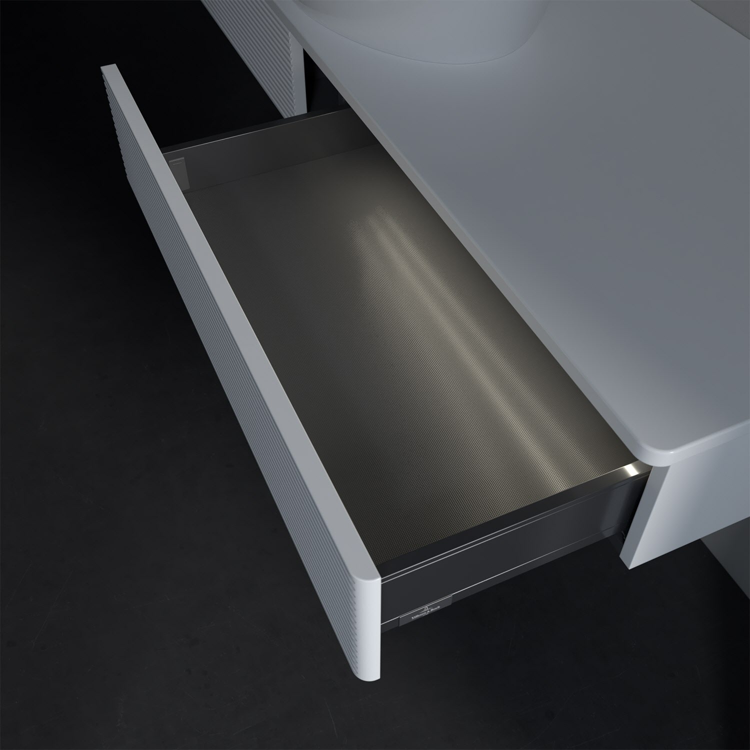Der wandhängende Antao Waschtischunterschrank bietet mit seinem Auszug und seiner erstaunlichen Größe viel Platz zum Verstauen von Utensilien im Badezimmer. Dank des mittig platzierten Aufsatzwaschtischs gibt es seitlich weiteren Platz für Handtücher, Seifenspender & Co. auf der Waschtischplatte. Inspiriert von der Natur überzeugt der Unterschrank auch optisch mit sanfter Formsprache und abgerundete Kanten. Der grifflose Auszug mit strukturierter Front ist mit der Push-to-Open Funktion ausgestattet und verfügt über einen Antirutschboden, damit Utensilien sicher verstaut werden können. Den Überblick behält man dank der warmweißen Auszugsbeleuchtung, die sich automatisch beim Öffnen einschaltet. Mit seiner Vollauszug- und Selbsteinzug-Funktion ist der Schrank einfach praktisch und leicht zu bedienen. Qualität von Villeroy & Boch! Für eine besonders leichte Pflege sorgt die mehrschichtig deckend lackierte Oberfläche.