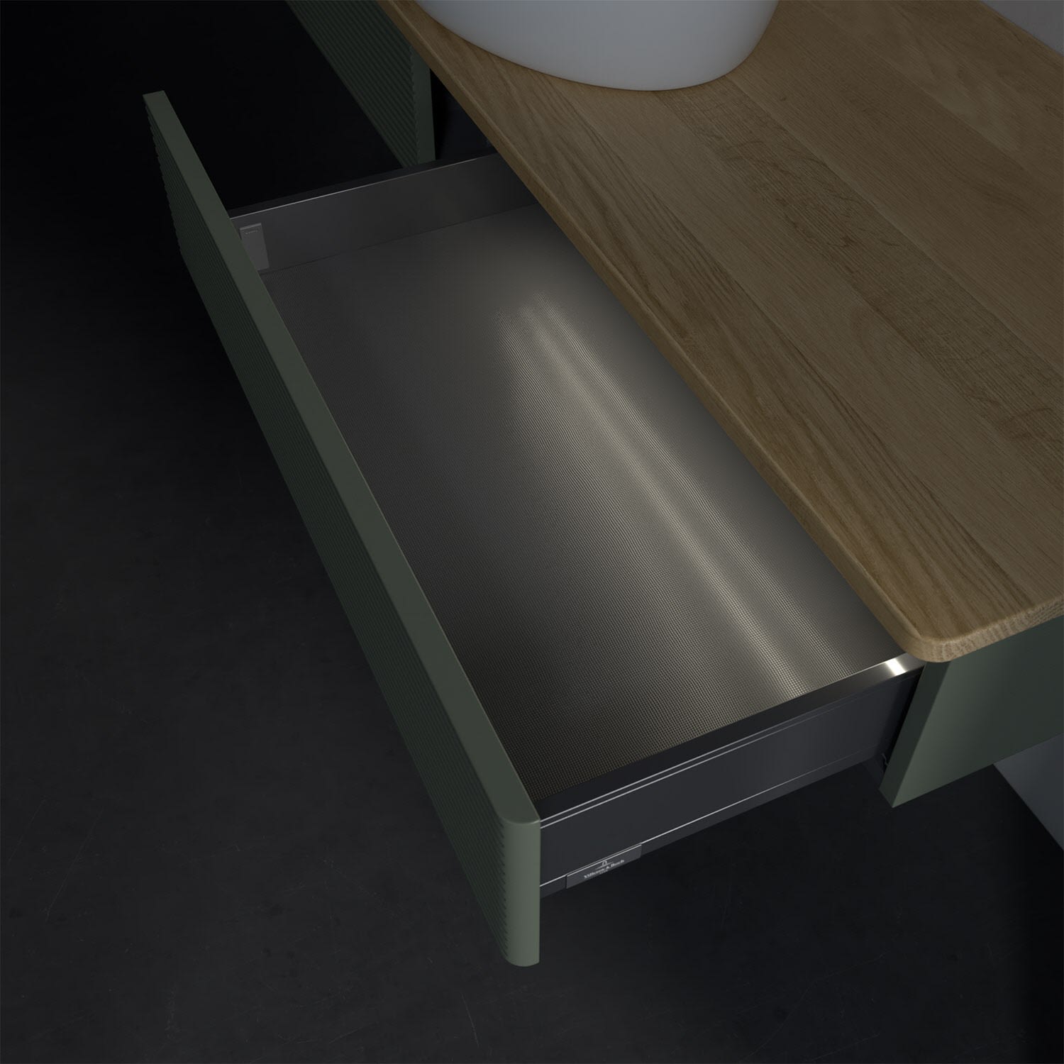 Der wandhängende Antao Waschtischunterschrank bietet mit seinem Auszug und seiner erstaunlichen Größe viel Platz zum Verstauen von Utensilien im Badezimmer. Dank des mittig platzierten Aufsatzwaschtischs gibt es seitlich weiteren Platz für Handtücher, Seifenspender & Co. auf der Waschtischplatte. Inspiriert von der Natur überzeugt der Unterschrank auch optisch mit sanfter Formsprache und abgerundete Kanten. Der grifflose Auszug mit strukturierter Front ist mit der Push-to-Open Funktion ausgestattet und verfügt über einen Antirutschboden, damit Utensilien sicher verstaut werden können. Den Überblick behält man dank der warmweißen Auszugsbeleuchtung, die sich automatisch beim Öffnen einschaltet. Mit seiner Vollauszug- und Selbsteinzug-Funktion ist der Schrank einfach praktisch und leicht zu bedienen. Qualität von Villeroy & Boch! Für eine besonders leichte Pflege sorgt die mehrschichtig deckend lackierte Oberfläche. Bei der Ausführung in Massivholz wird dank des verarbeiteten Massivholzes jedes Möbel zu einem Unikat, das sich durch das lebendige Naturmaterial durch seine einzigartige Struktur und Maserung auszeichnet.
