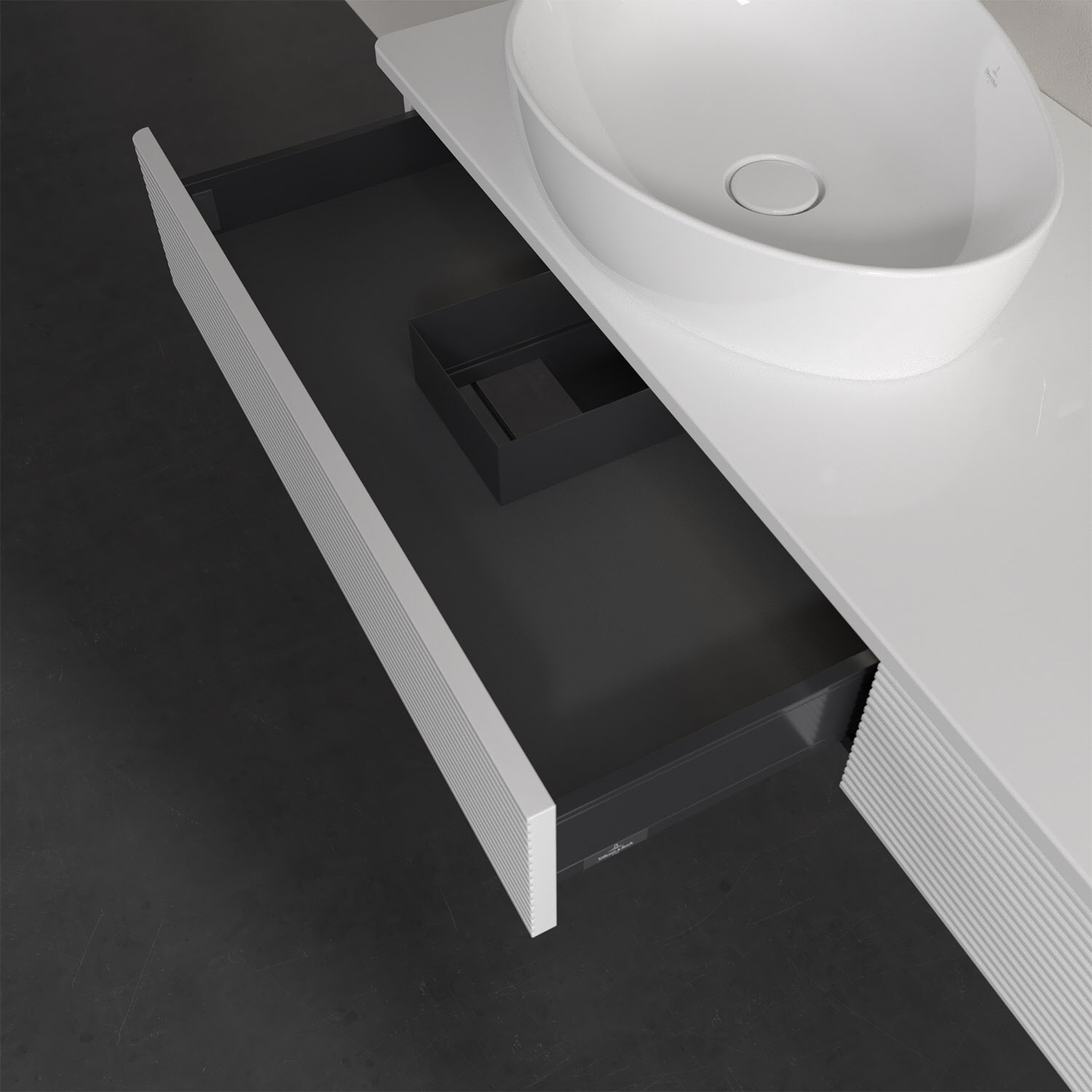 Villeroy & Boch Antao Waschbeckenunterschrank, 160 x 19 cm, 2 Auszüge mit LED-Licht, Front mit Struktur, ohne Hahnloch, für Waschtisch links
