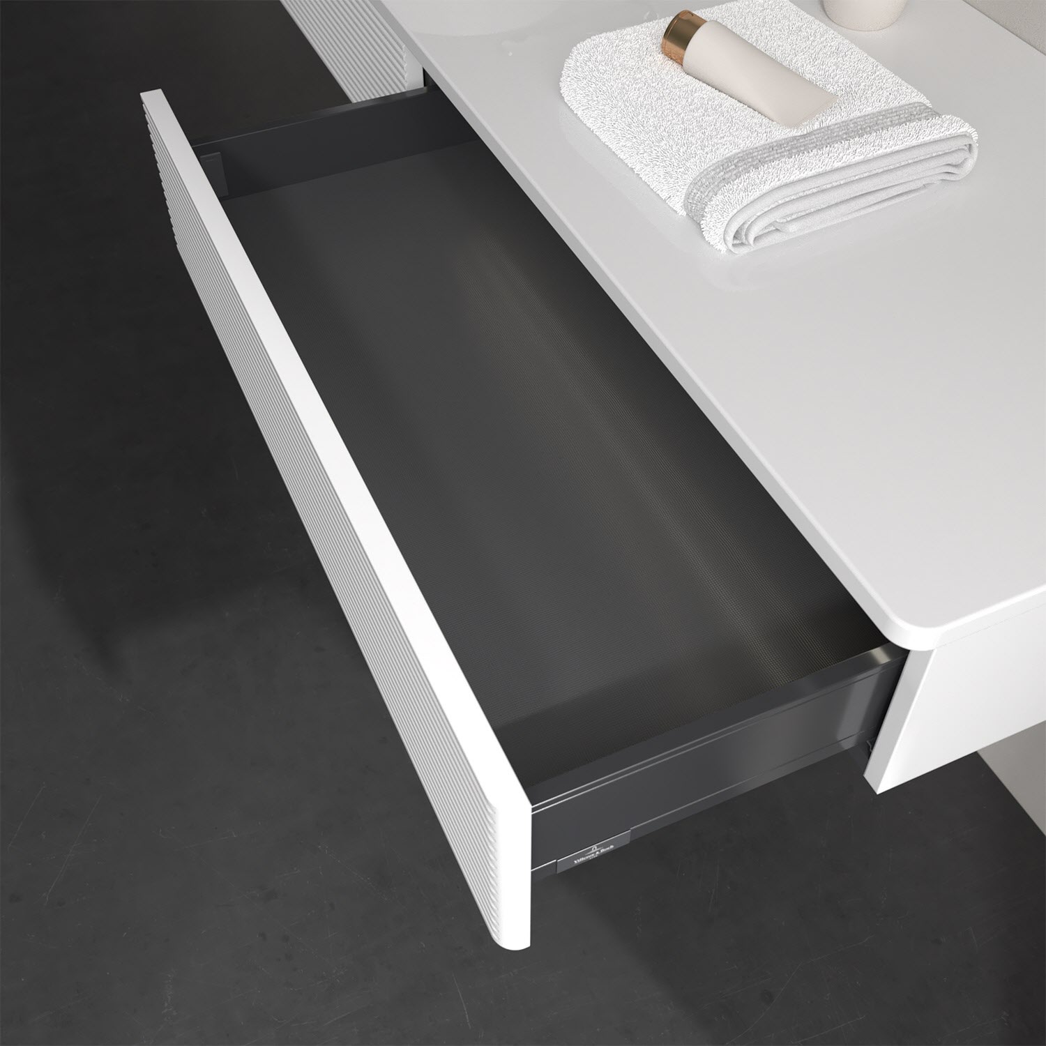 - kein Umfallen oder Verrutschen von Pflegeprodukten in den Schubladen dank rutschhemmendem Boden