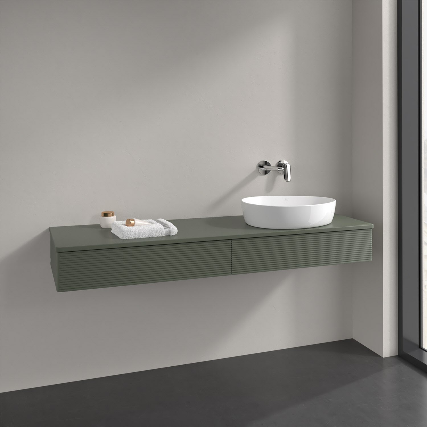 Villeroy & Boch Antao Waschbeckenunterschrank, 160 x 19 cm, 2 Auszüge mit LED-Licht, Front mit Struktur, ohne Hahnloch, für Waschtisch rechts