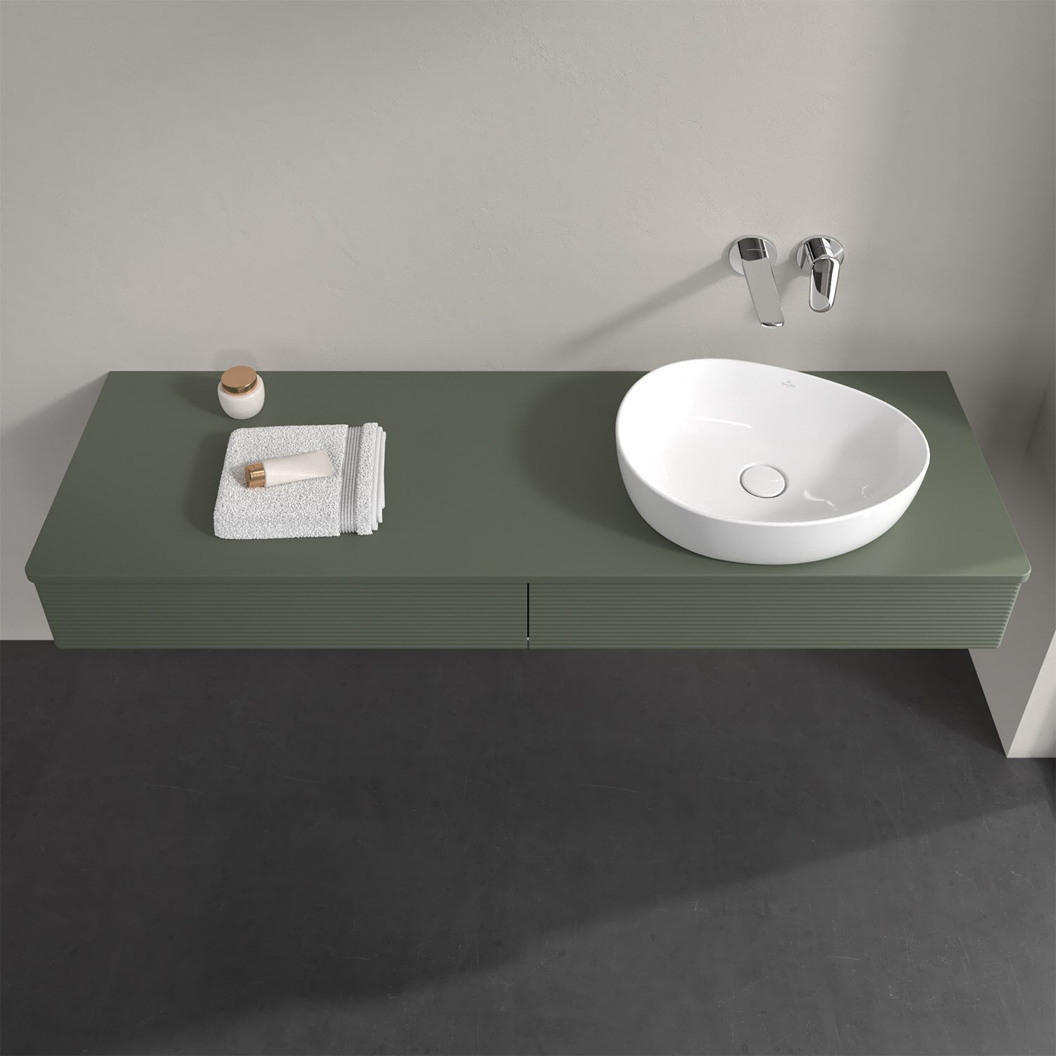 Für diesen Waschbeckenunterschrank stehen Ihnen Aufsatzwaschtische aus verschiedenen Serien zur Verfügung (siehe "Passliste" unter Downloads). Ein ausgewähltes Beispiel finden Sie im Zubehör. Den Waschtisch bitte separat mitbestellen.