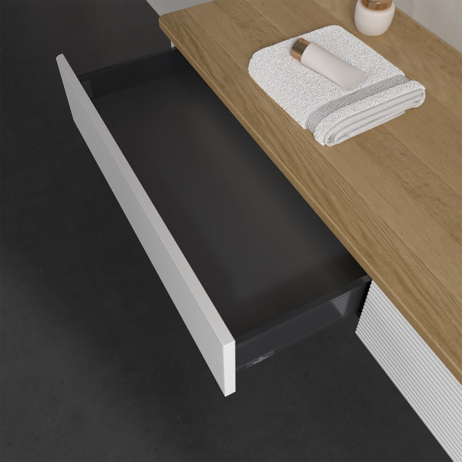 Villeroy & Boch Antao Waschbeckenunterschrank, 160 x 19 cm, 2 Auszüge mit LED-Licht, Front mit Struktur, ohne Hahnloch, für Waschtisch rechts