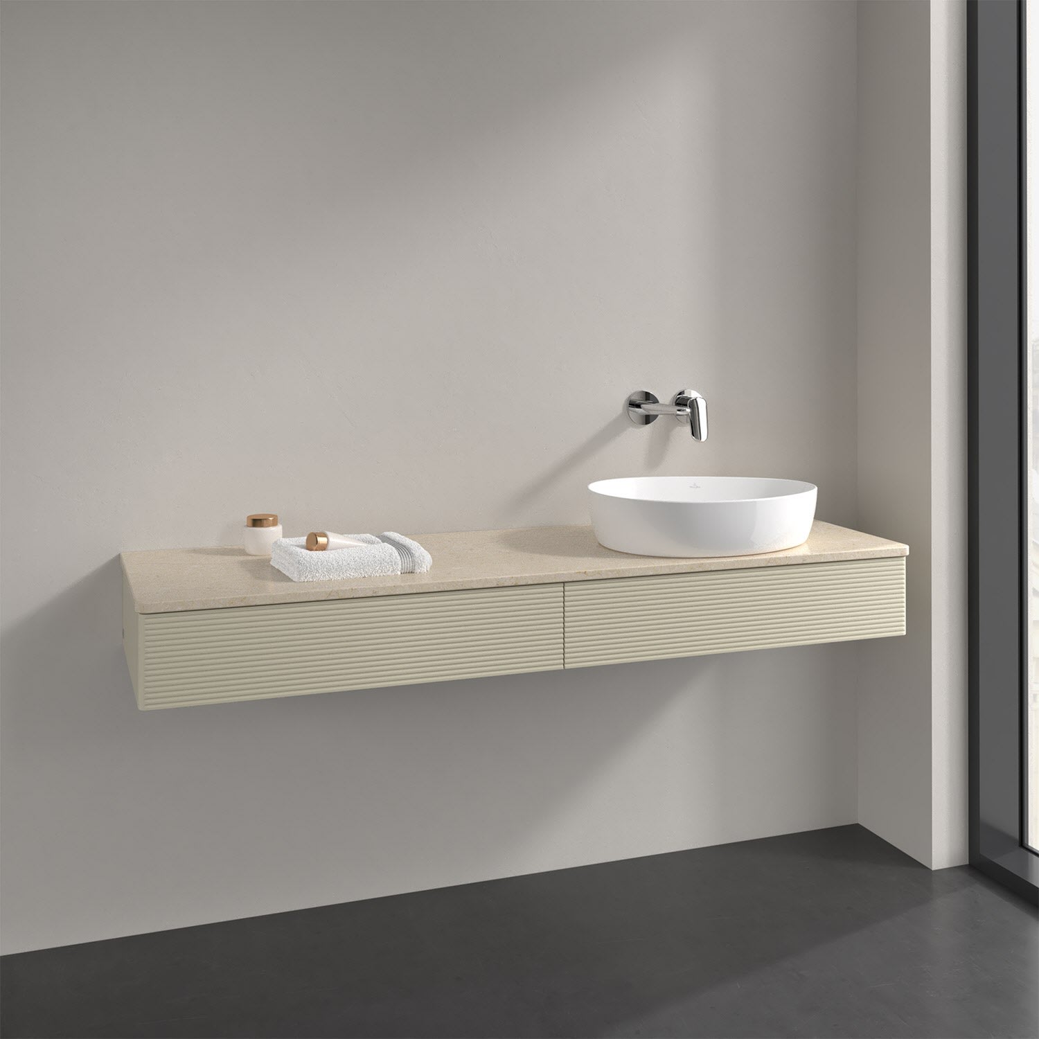 Villeroy & Boch Antao Waschbeckenunterschrank, 160 x 19 cm, 2 Auszüge mit LED-Licht, Front mit Struktur, ohne Hahnloch, für Waschtisch rechts
