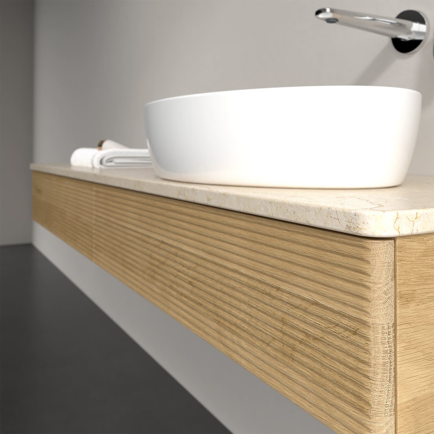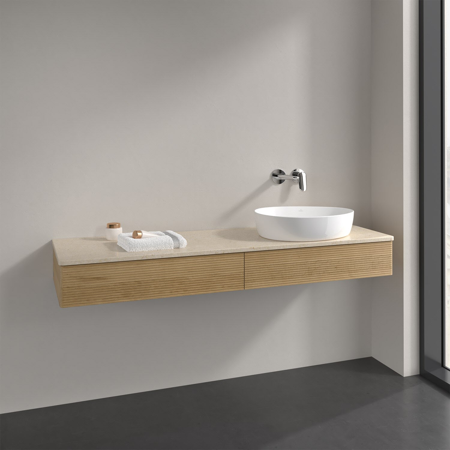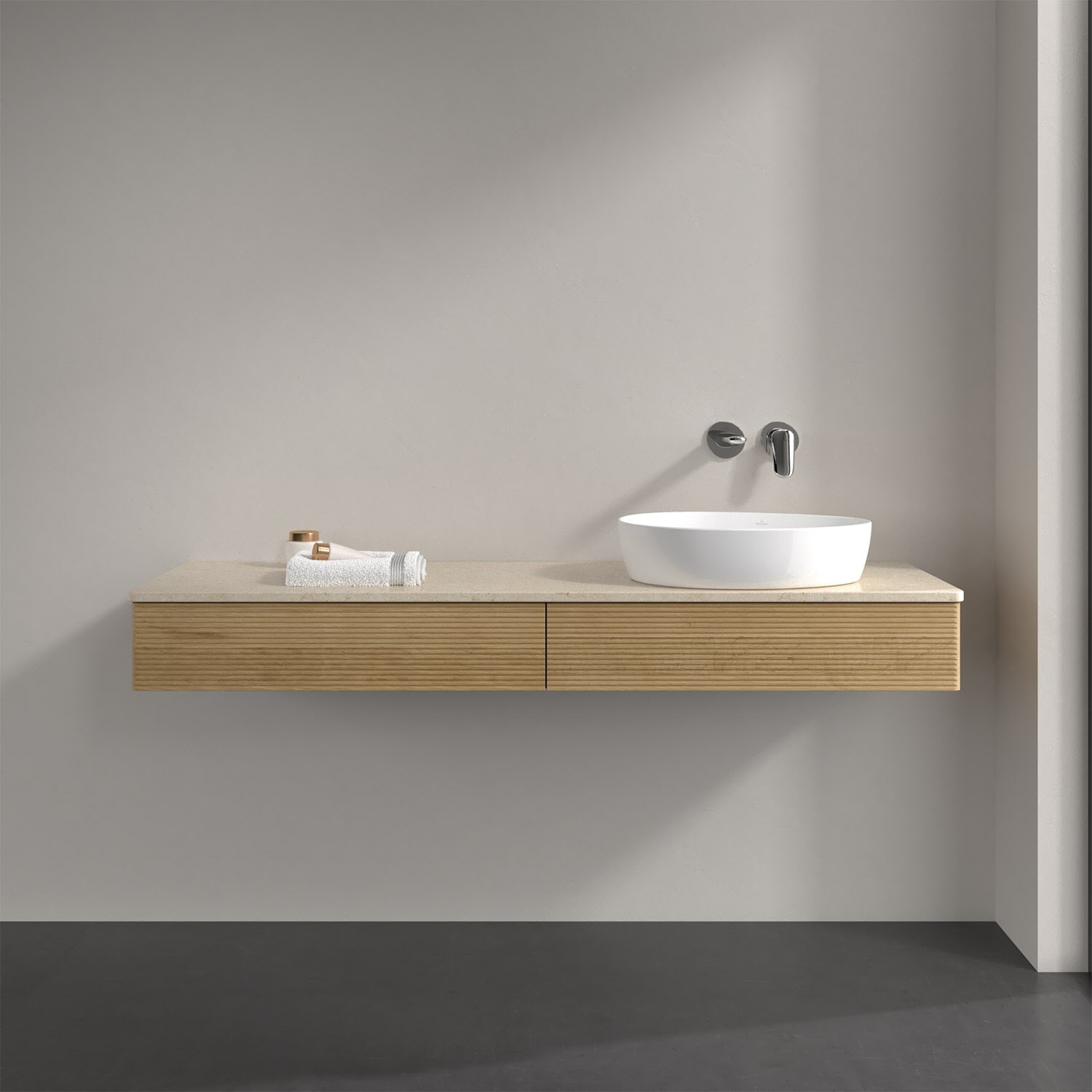 Villeroy & Boch Antao Waschbeckenunterschrank, 160 x 19 cm, 2 Auszüge mit LED-Licht, Front mit Struktur, ohne Hahnloch, für Waschtisch rechts