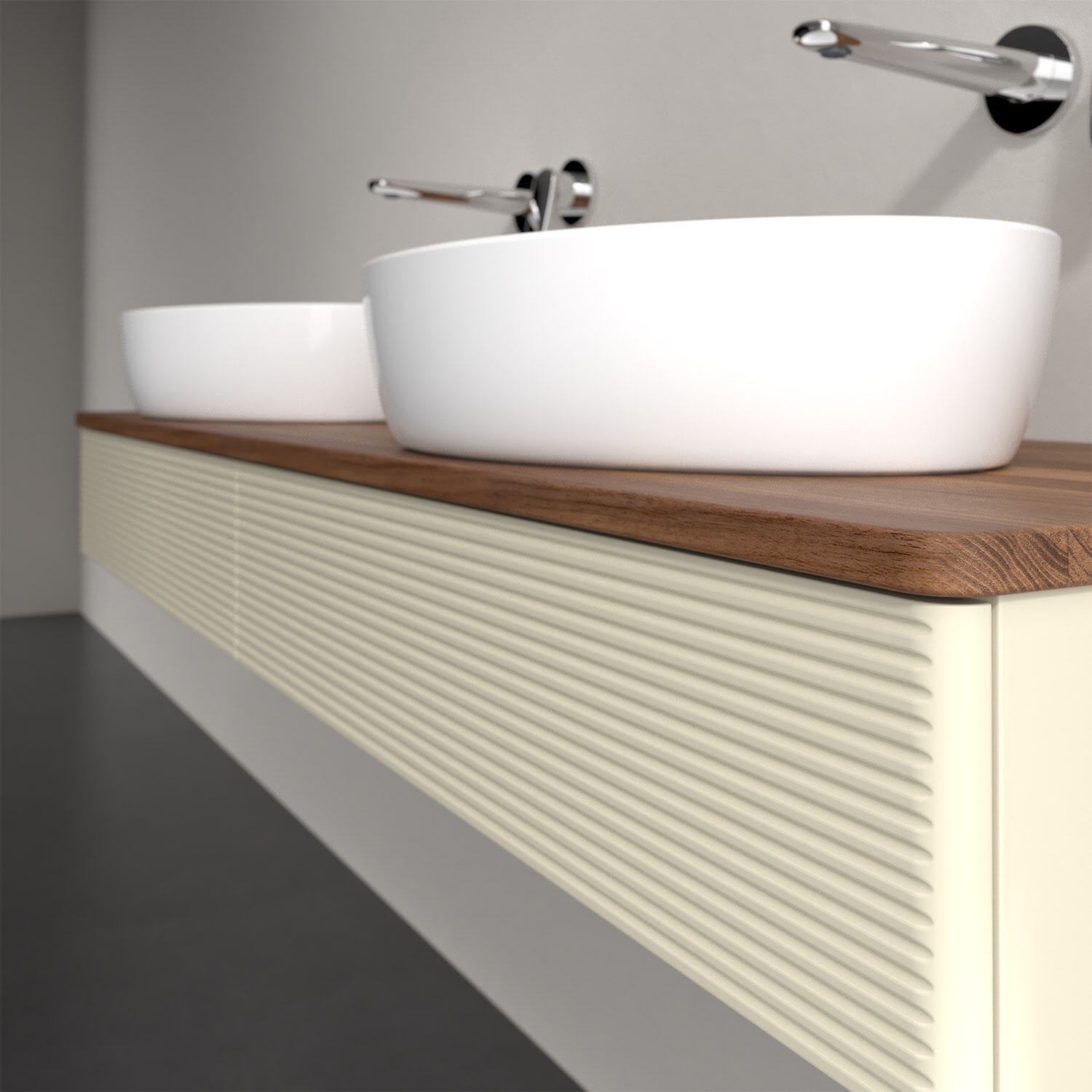 Der wandhängende Antao Waschtischunterschrank für zwei Aufsatzwaschtische bietet mit seinen beiden Auszügen und seiner erstaunlichen Größe viel Platz zum Verstauen von Utensilien im Badezimmer. Inspiriert von der Natur überzeugt der Unterschrank auch optisch mit sanfter Formsprache und abgerundete Kanten. Die grifflosen Auszüge mit strukturierter Front sind mit der Push-to-Open Funktion ausgestattet und verfügen über einen Antirutschboden, damit Utensilien sicher verstaut werden können. Den Überblick behält man dank der warmweißen Auszugsbeleuchtung, die sich automatisch beim Öffnen einschaltet. Mit seiner Vollauszug- und Selbsteinzug-Funktion ist der Schrank einfach praktisch und leicht zu bedienen. Qualität von Villeroy & Boch! Für eine besonders leichte Pflege sorgt die mehrschichtig deckend lackierte Oberfläche. Bei der Ausführung in Massivholz wird dank des verarbeiteten Massivholzes jedes Möbel zu einem Unikat, das sich durch das lebendige Naturmaterial durch seine einzigartige Struktur und Maserung auszeichnet.