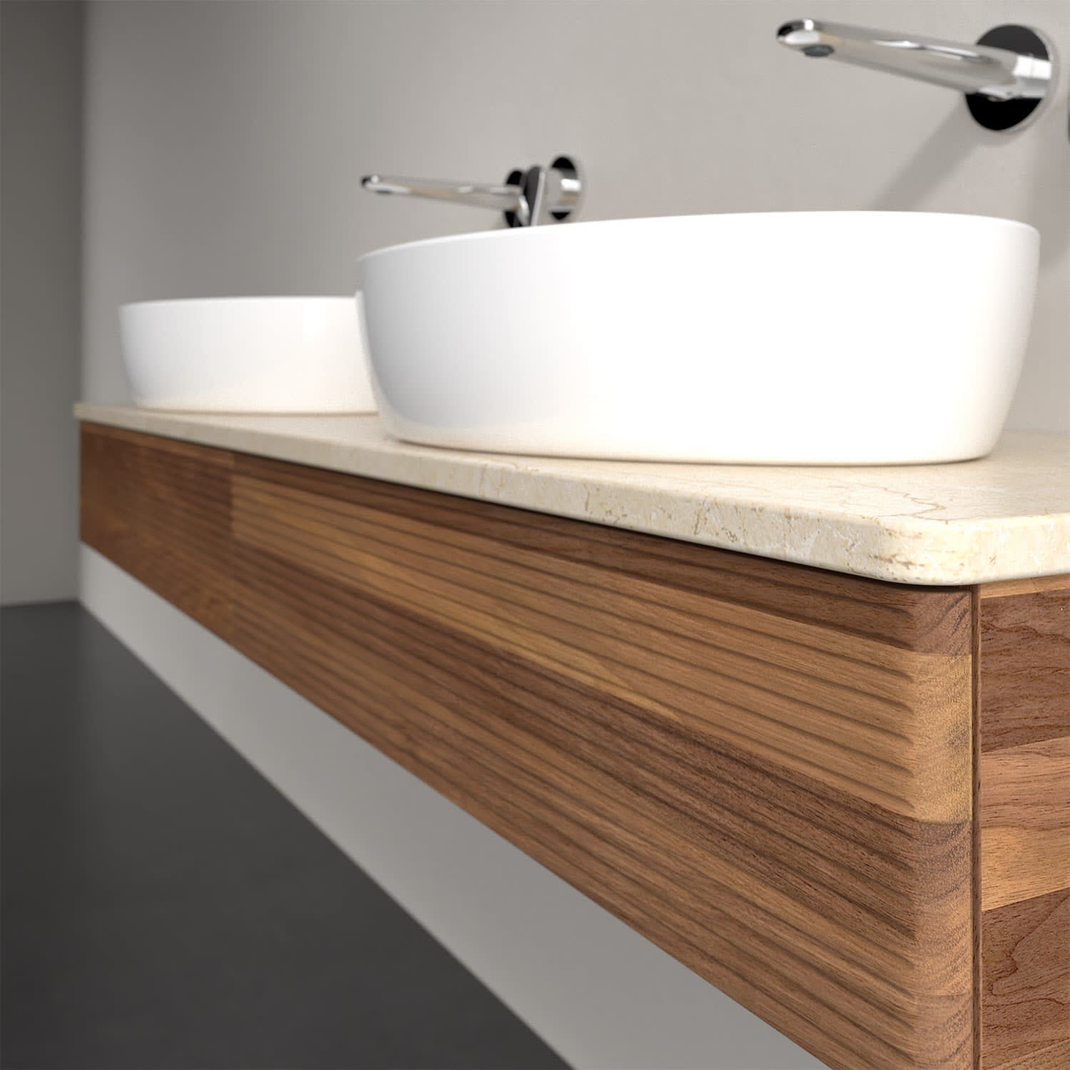 Der wandhängende Antao Waschtischunterschrank für zwei Aufsatzwaschtische bietet mit seinen beiden Auszügen und seiner erstaunlichen Größe viel Platz zum Verstauen von Utensilien im Badezimmer. Inspiriert von der Natur überzeugt der Unterschrank auch optisch mit sanfter Formsprache und abgerundete Kanten. Die grifflosen Auszüge mit strukturierter Front sind mit der Push-to-Open Funktion ausgestattet und verfügen über einen Antirutschboden, damit Utensilien sicher verstaut werden können. Den Überblick behält man dank der warmweißen Auszugsbeleuchtung, die sich automatisch beim Öffnen einschaltet. Mit seiner Vollauszug- und Selbsteinzug-Funktion ist der Schrank einfach praktisch und leicht zu bedienen. Qualität von Villeroy & Boch! Für eine besonders leichte Pflege sorgt die mehrschichtig deckend lackierte Oberfläche. Bei der Ausführung in Massivholz wird dank des verarbeiteten Massivholzes jedes Möbel zu einem Unikat, das sich durch das lebendige Naturmaterial durch seine einzigartige Struktur und Maserung auszeichnet.