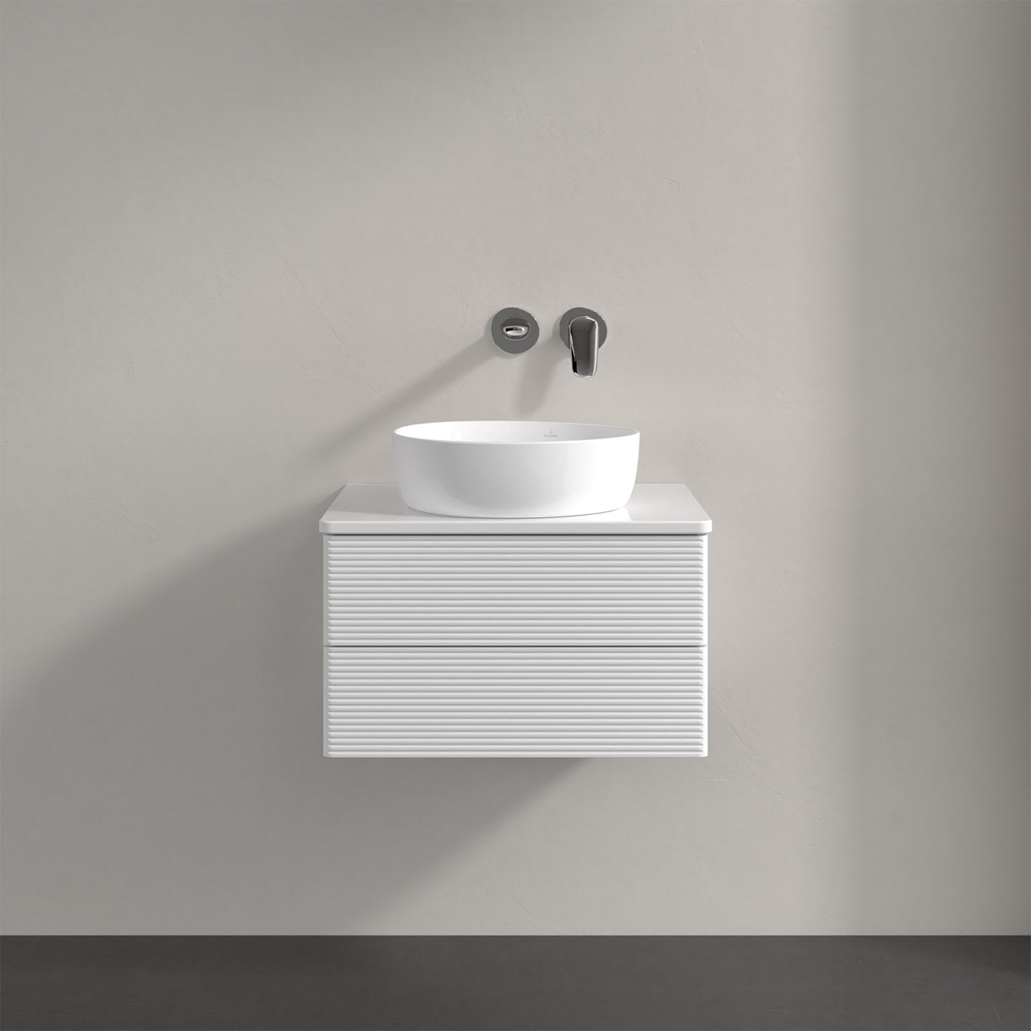 Wenig Platz im Badezimmer und dennoch soll es gemütlich und ordentlich sein? Dann ist der wandhängende Antao Waschtischunterschrank mit seinen sanft abgerundeten Kanten die ideale Lösung. Das geräumige Möbel bietet ausreichend Stauraum für alle nötigen Badutensilien. Zum Öffnen genügt dank der Push-to-Open Funktion ein leichter Druck auf die beiden Auszüge mit strukturierter Front, die sich dann in ihrer vollen Tiefe öffnen. Dabei wird gleichzeitig die angenehme Auszugsbeleuchtung in Warmweiß aktiviert. Das garantiert den benötigen Überblick! Praktisch ist auch der integrierte Antirutschboden und die SoftClosing Funktion, die ein Umfallen oder Verrutschen der verstauten Produkte verhindern. Villeroy & Boch hat alles durchdacht! Für eine besonders leichte Pflege sorgt die mehrschichtig deckend lackierte Oberfläche.