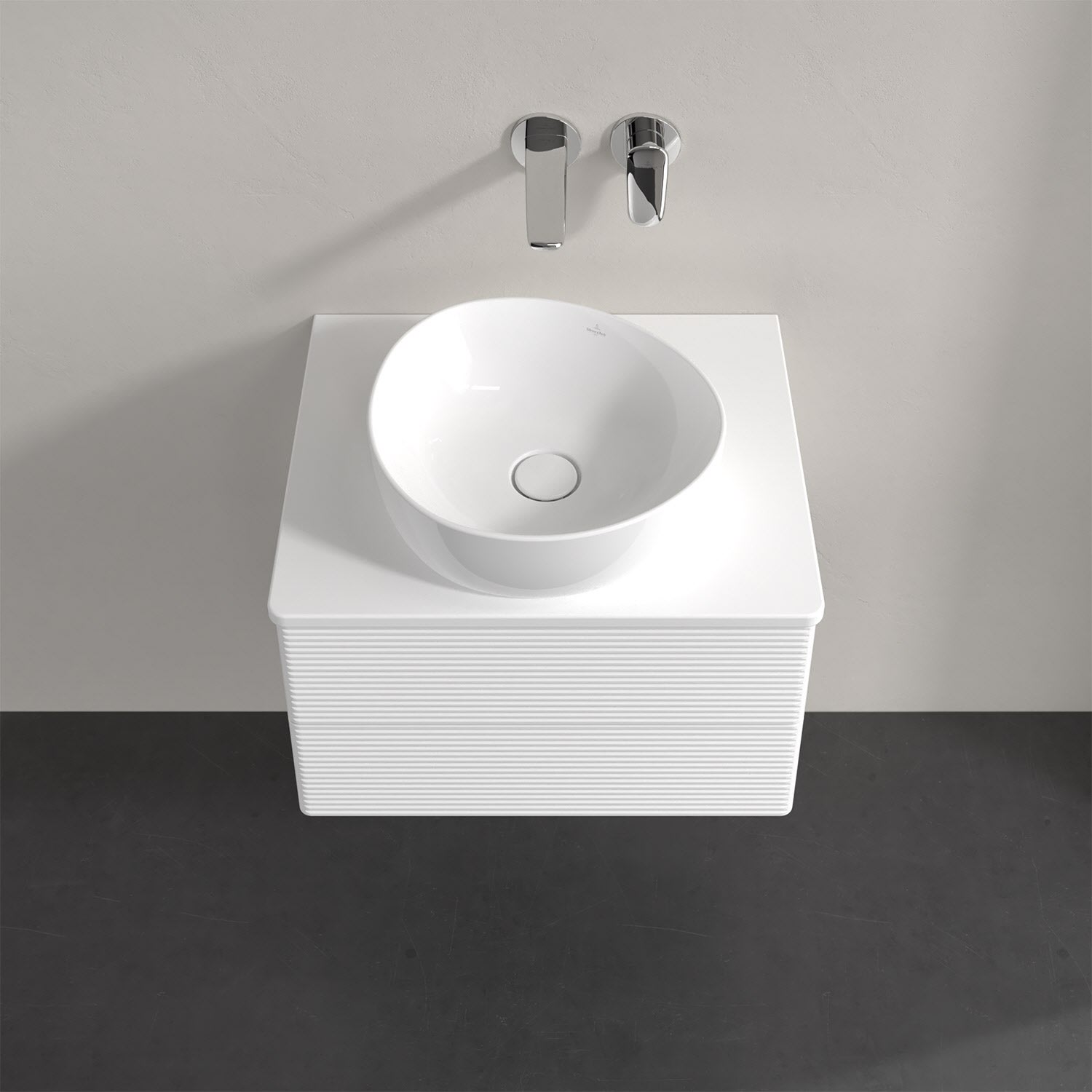 Für diesen Waschbeckenunterschrank stehen Ihnen Aufsatzwaschtische aus verschiedenen Serien zur Verfügung (siehe "Passliste" unter Downloads). Ein ausgewähltes Beispiel finden Sie im Zubehör. Den Waschtisch bitte separat mitbestellen.