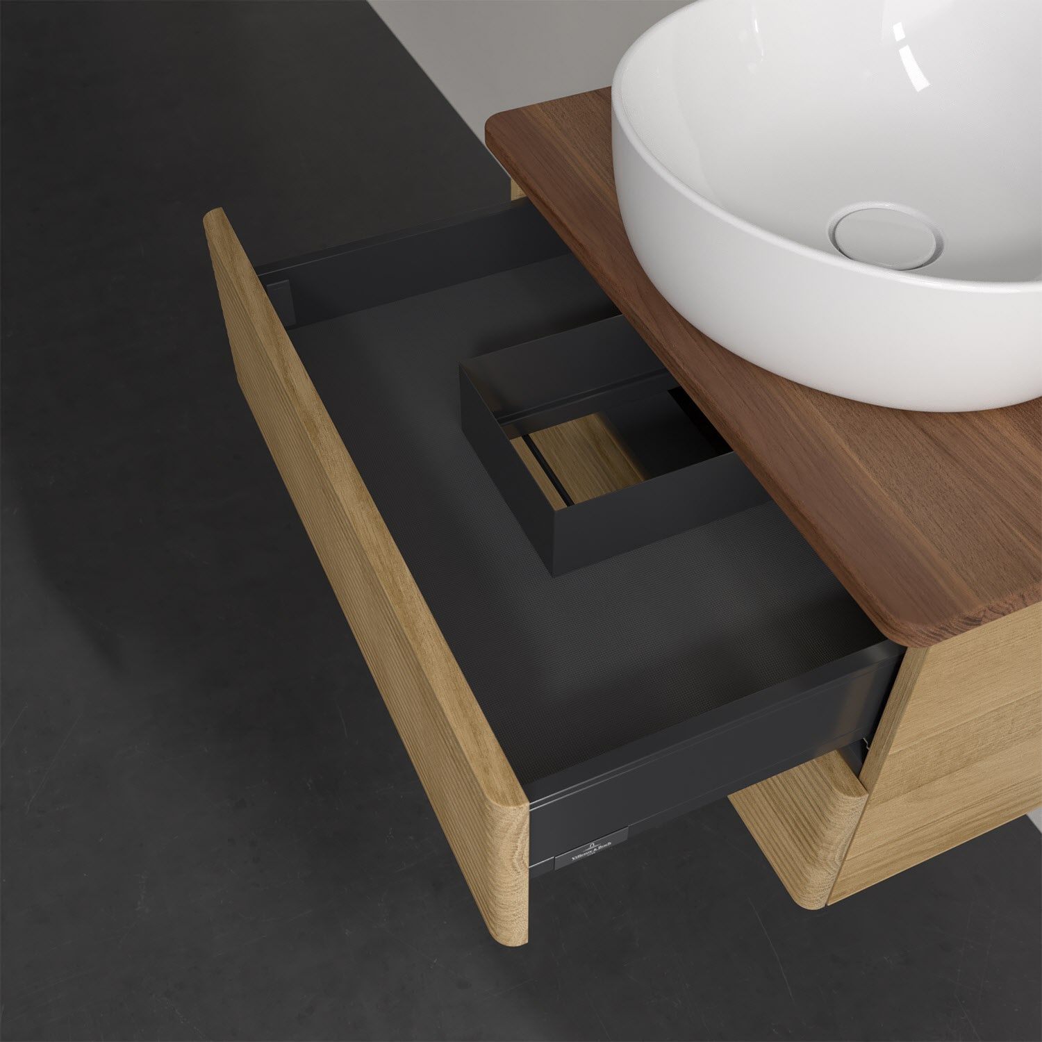 Für diesen Waschbeckenunterschrank stehen Ihnen Aufsatzwaschtische aus verschiedenen Serien zur Verfügung (siehe "Passliste" unter Downloads). Ein ausgewähltes Beispiel finden Sie im Zubehör. Den Waschtisch bitte separat mitbestellen.