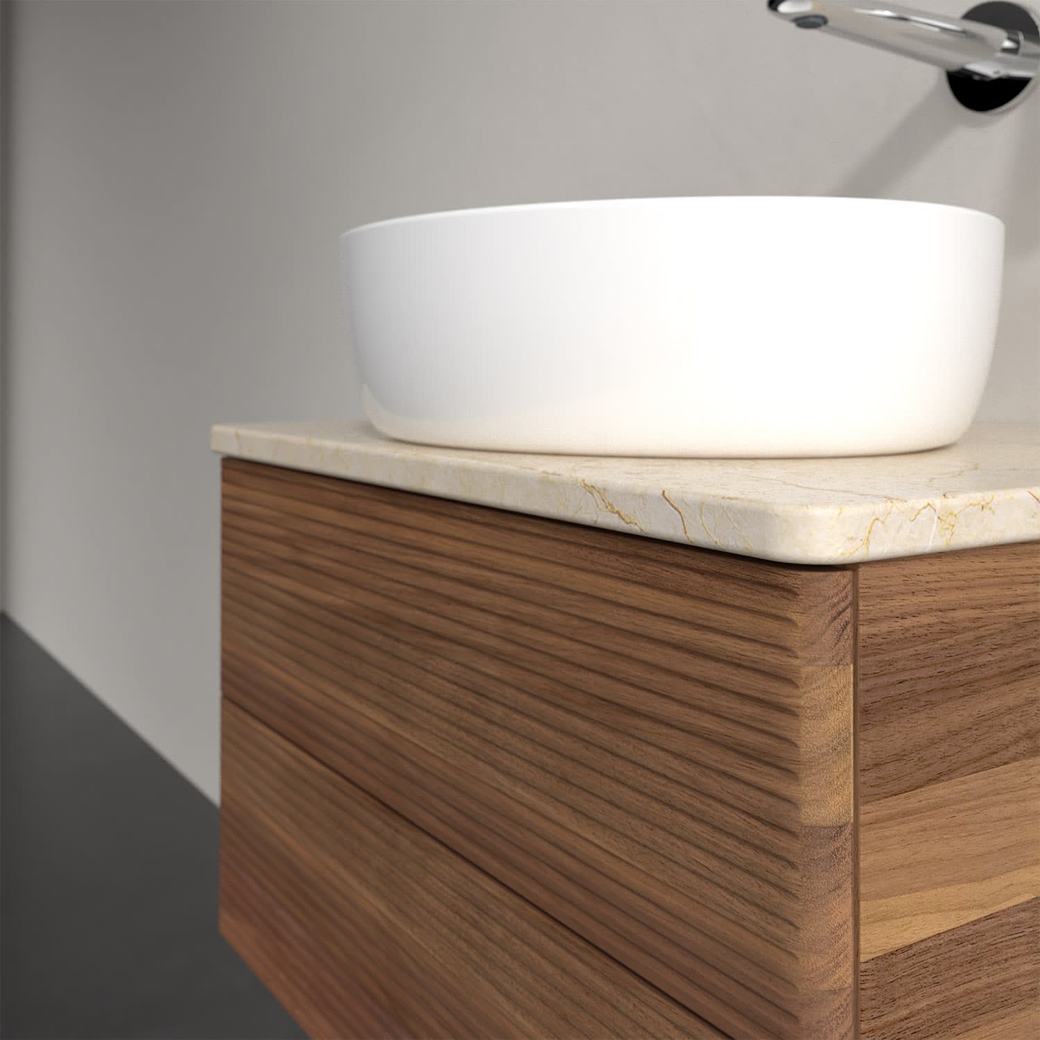 Für diesen Waschbeckenunterschrank stehen Ihnen Aufsatzwaschtische aus verschiedenen Serien zur Verfügung (siehe "Passliste" unter Downloads). Ein ausgewähltes Beispiel finden Sie im Zubehör. Den Waschtisch bitte separat mitbestellen.