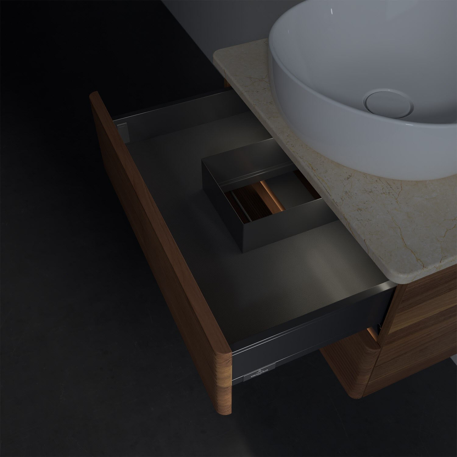 - in Schublade integrierte LED-Leiste mit warmweißem Licht zur Beleuchtung des Innenlebens