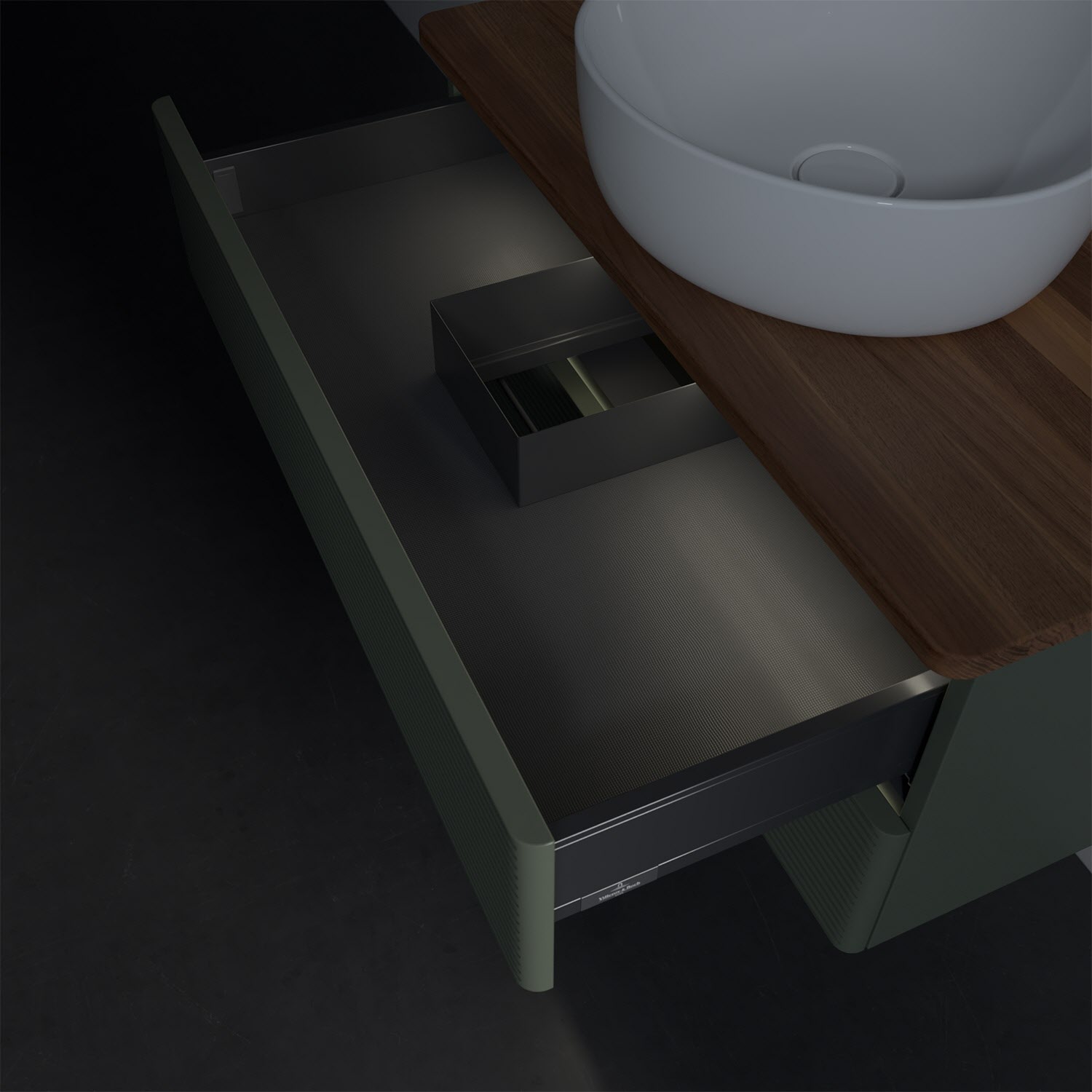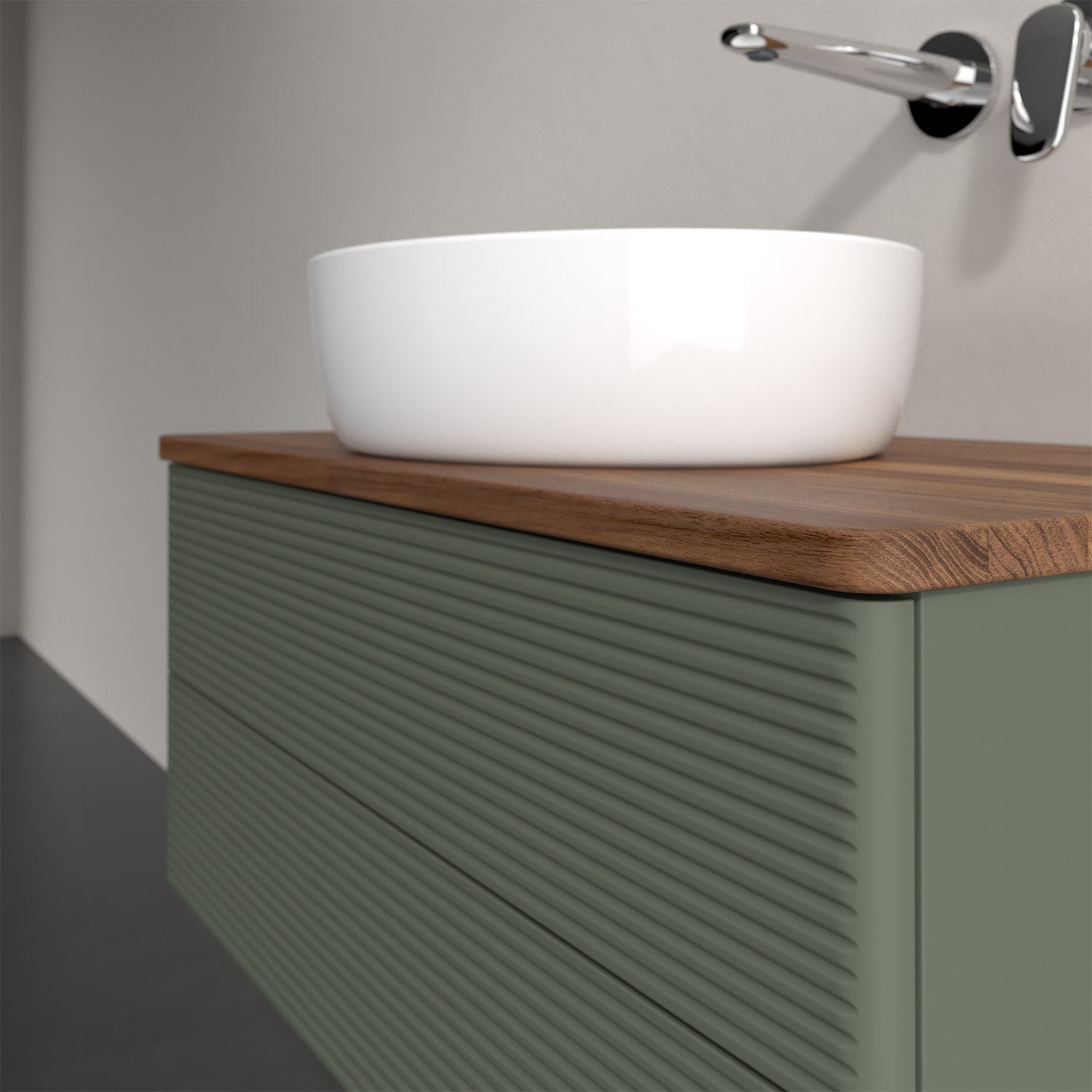 Mit dem wandhängenden Waschtischunterschrank der Kollektion Antao wird ein natürliches und gemütliches Flair am Waschplatz geschaffen. Dafür sorgen die sanfte Formsprache mit abgerundeten Kanten und die strukturierte Front des hochwertigen Badmöbels. Die wichtigsten Badutensilien für die tägliche Routine können seitlich des Waschtischs auf die Waschtischplatte gestellt werden. Ansonsten bieten zwei Auszüge inklusive warmweißer Beleuchtung und Antirutschboden ausreichend Platz für weitere Produkte, die garantiert bleiben, wo sie hingehören. Der Unterschrank verfügt zudem über einen Vollauszug und Selbsteinzug mit SoftClosing Funktion, damit er bequem und mühelos geöffnet und geschlossen werden kann. Gewohnte Qualität von Villeroy & Boch! Für eine besonders leichte Pflege sorgt die mehrschichtig deckend lackierte Oberfläche. Bei der Ausführung in Massivholz wird dank des verarbeiteten Massivholzes jedes Möbel zu einem Unikat, das sich durch das lebendige Naturmaterial durch seine einzigartige Struktur und Maserung auszeichnet.