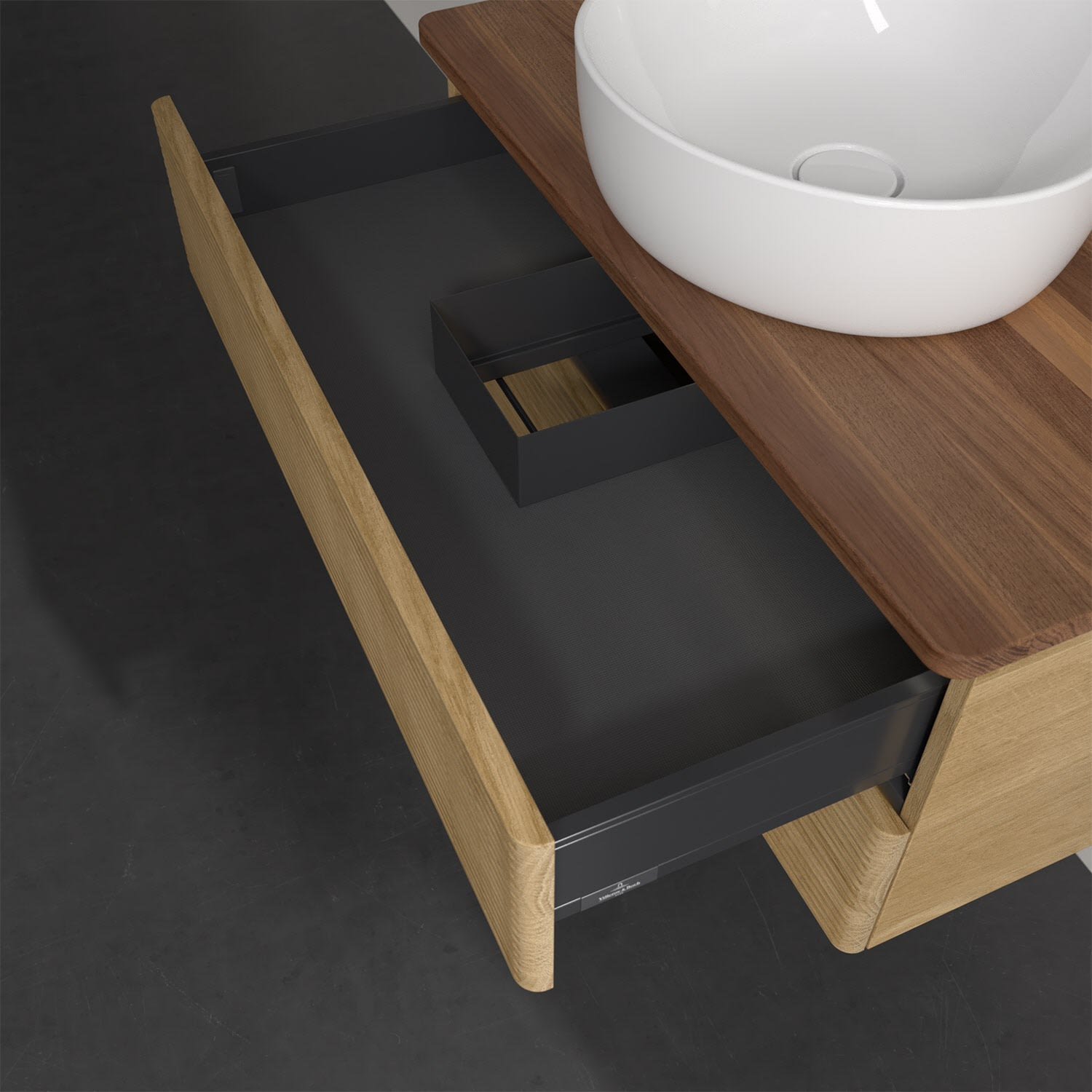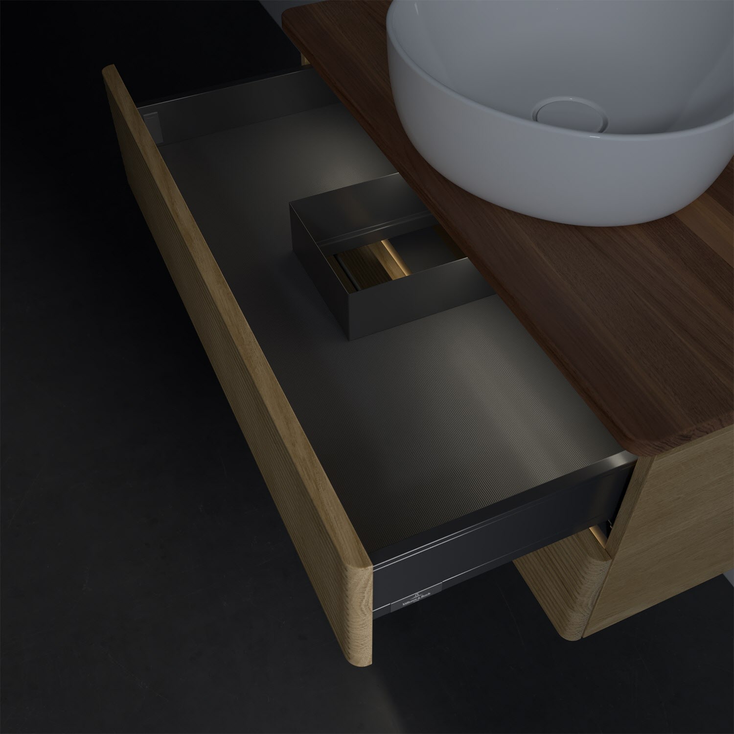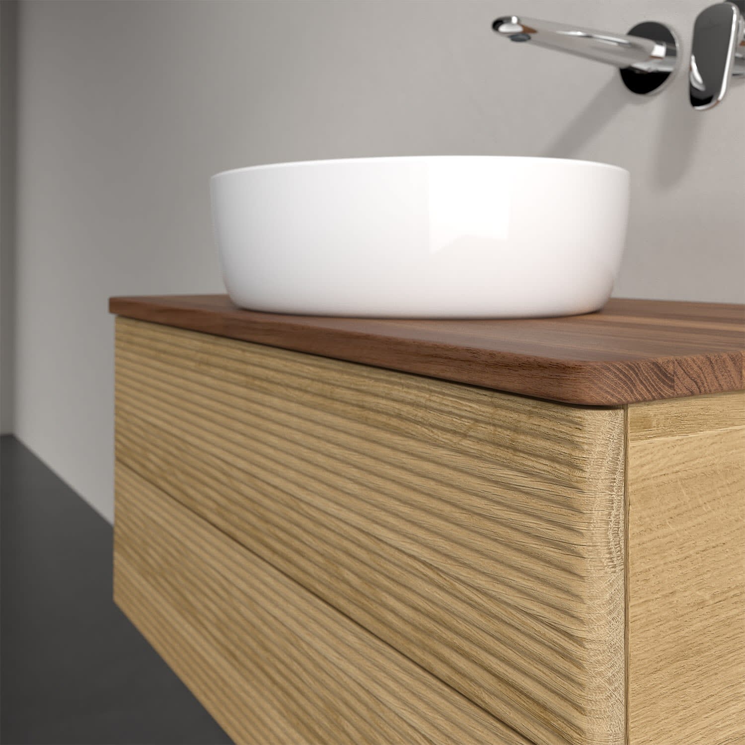 Mit dem wandhängenden Waschtischunterschrank der Kollektion Antao wird ein natürliches und gemütliches Flair am Waschplatz geschaffen. Dafür sorgen die sanfte Formsprache mit abgerundeten Kanten und die strukturierte Front des hochwertigen Badmöbels. Die wichtigsten Badutensilien für die tägliche Routine können seitlich des Waschtischs auf die Waschtischplatte gestellt werden. Ansonsten bieten zwei Auszüge inklusive warmweißer Beleuchtung und Antirutschboden ausreichend Platz für weitere Produkte, die garantiert bleiben, wo sie hingehören. Der Unterschrank verfügt zudem über einen Vollauszug und Selbsteinzug mit SoftClosing Funktion, damit er bequem und mühelos geöffnet und geschlossen werden kann. Gewohnte Qualität von Villeroy & Boch! Für eine besonders leichte Pflege sorgt die mehrschichtig deckend lackierte Oberfläche. Bei der Ausführung in Massivholz wird dank des verarbeiteten Massivholzes jedes Möbel zu einem Unikat, das sich durch das lebendige Naturmaterial durch seine einzigartige Struktur und Maserung auszeichnet.