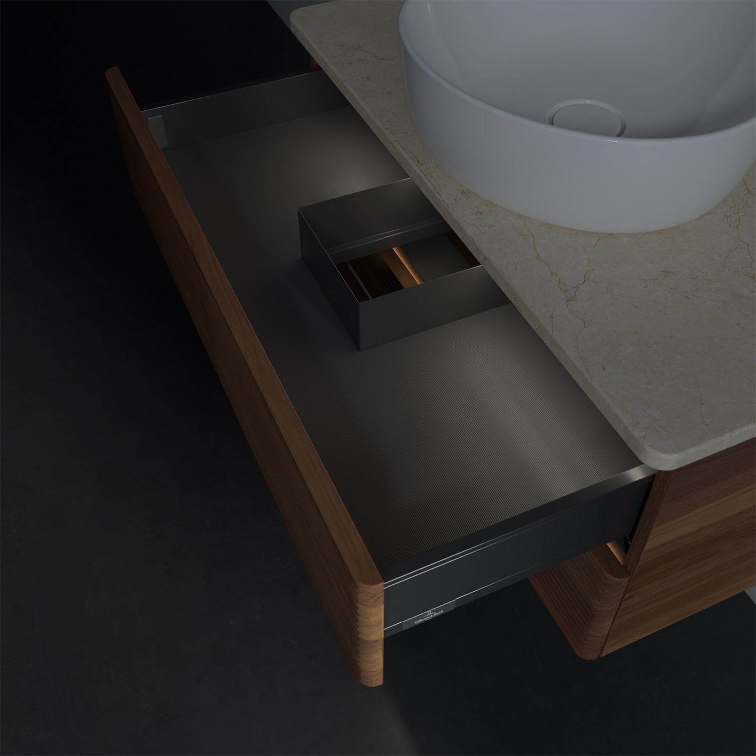 - in Schublade integrierte LED-Leiste mit warmweißem Licht zur Beleuchtung des Innenlebens