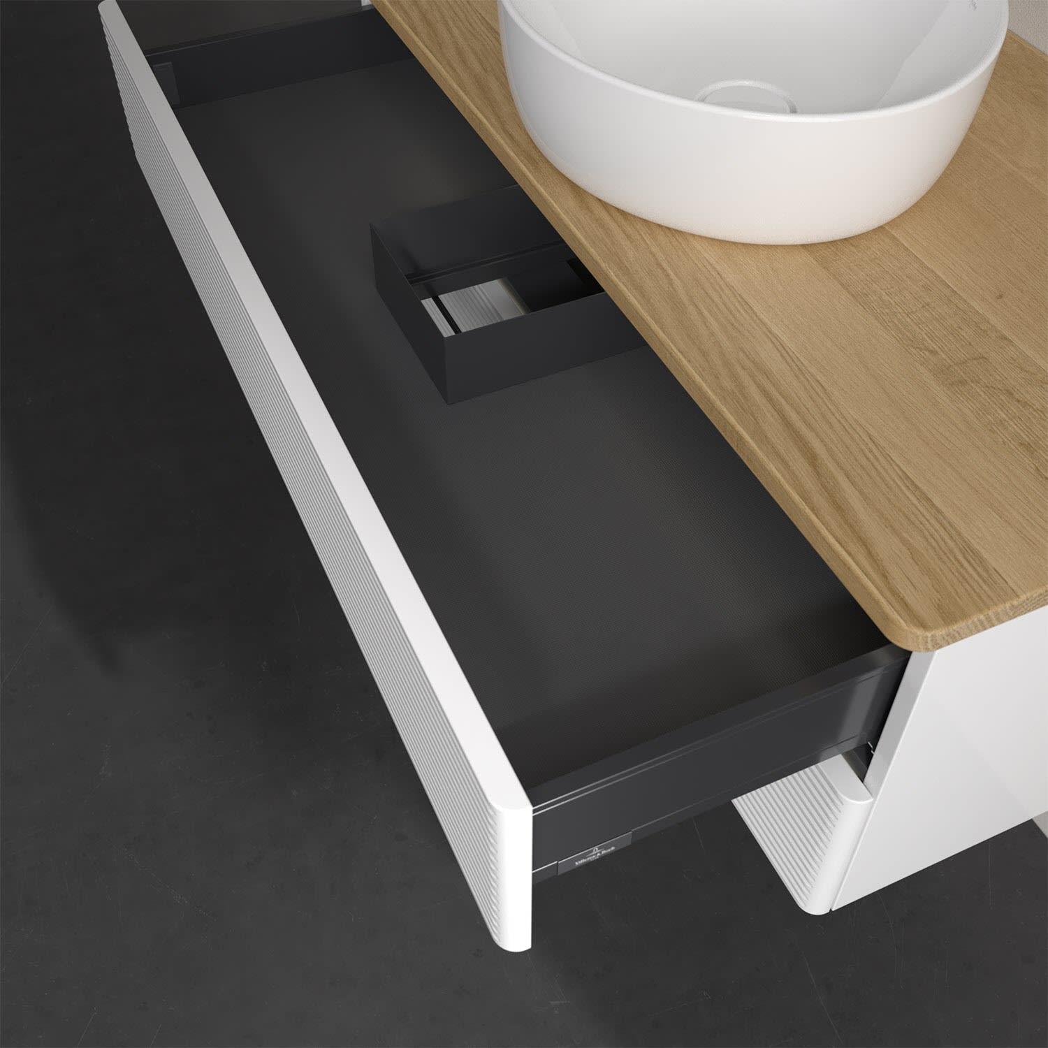 - kein Umfallen oder Verrutschen von Pflegeprodukten in den Schubladen dank rutschhemmendem Boden