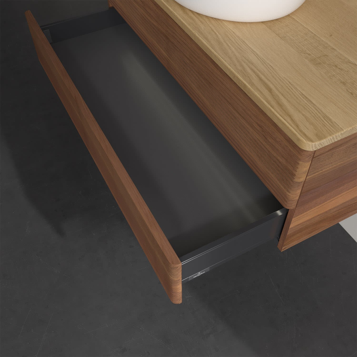 - in Schublade integrierte LED-Leiste mit warmweißem Licht zur Beleuchtung des Innenlebens