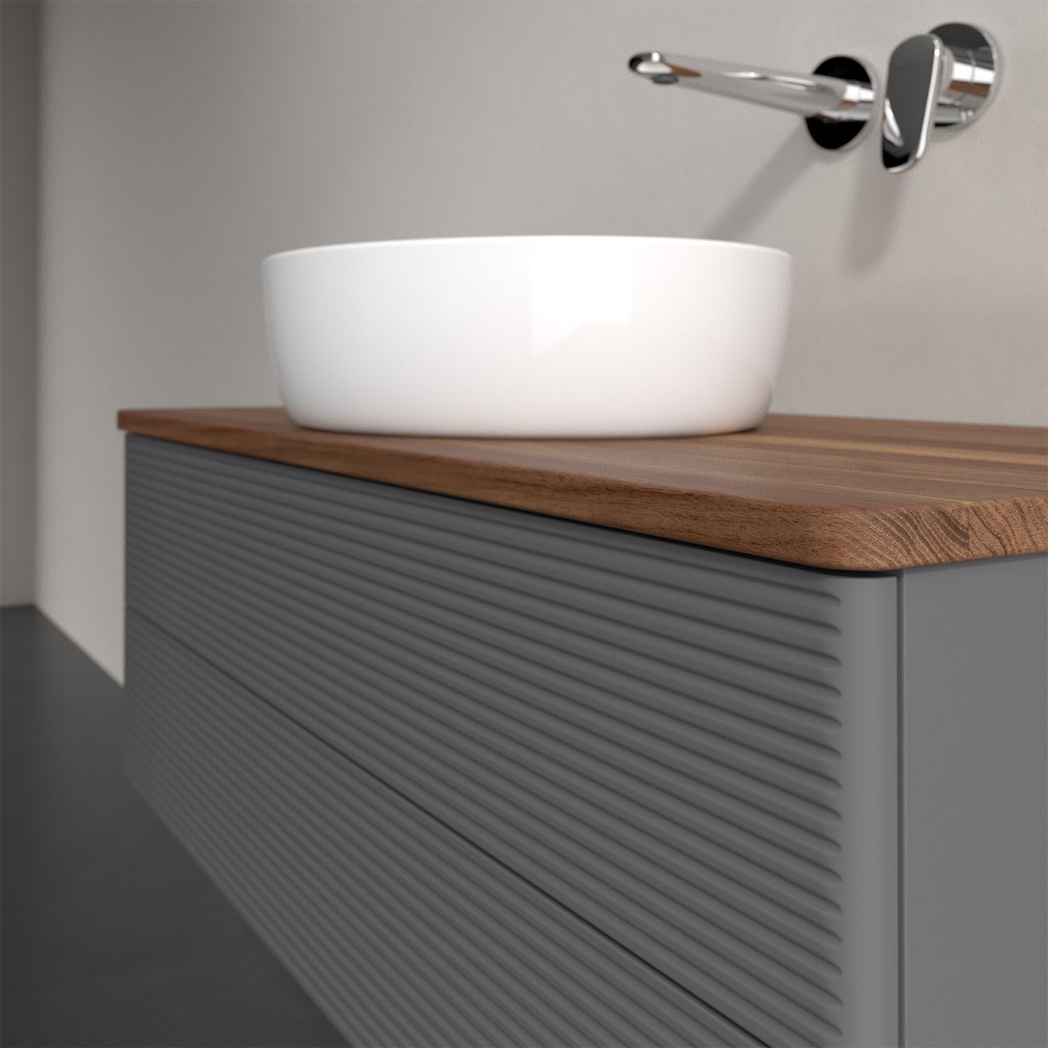 Mit dem wandhängenden Antao Waschtischunterschrank entscheidet man sich für eine hochwertige und praktische Stauraumlösung, die viel Freude bereitet. Die Funktionen sind besonders gut durchdacht: Im Inneren der beiden vollausziehbaren Auszüge können Handtücher, Kosmetik oder andere Pflegeprodukte dank des Antirutschbodens bequem aufbewahrt werden. Geöffnet wird das Möbel durch leichten Druck auf die strukturierte Front. Der Clou: Dabei schaltet sich die warmweiße Auszugsbeleuchtung ein. Natürlich verfügen die Auszüge über eingebaute Dämpfer, die sie anschließend wieder sanft und leise schließen lassen. Auch auf der Waschtischplatte finden die wichtigsten Utensilien seitlich des Waschtischs genügend Platz. Optisch sorgt der Unterschrank von Villeroy & Boch mit seinen abgerundeten Kanten für ein modernes, gemütliches Ambiente. Für eine besonders leichte Pflege sorgt die mehrschichtig deckend lackierte Oberfläche. Bei der Ausführung in Massivholz wird dank des verarbeiteten Massivholzes jedes Möbel zu einem Unikat, das sich durch das lebendige Naturmaterial durch seine einzigartige Struktur und Maserung auszeichnet.