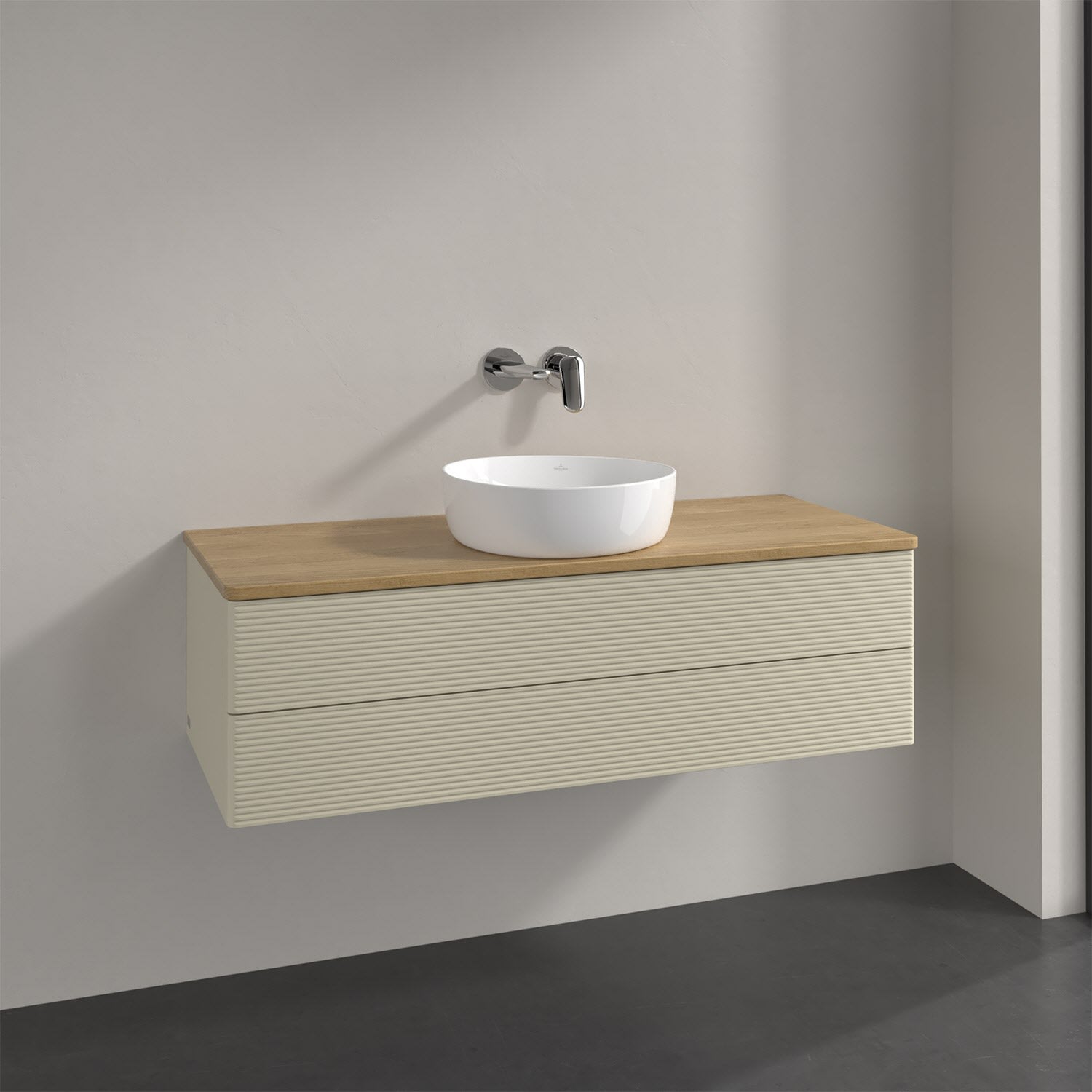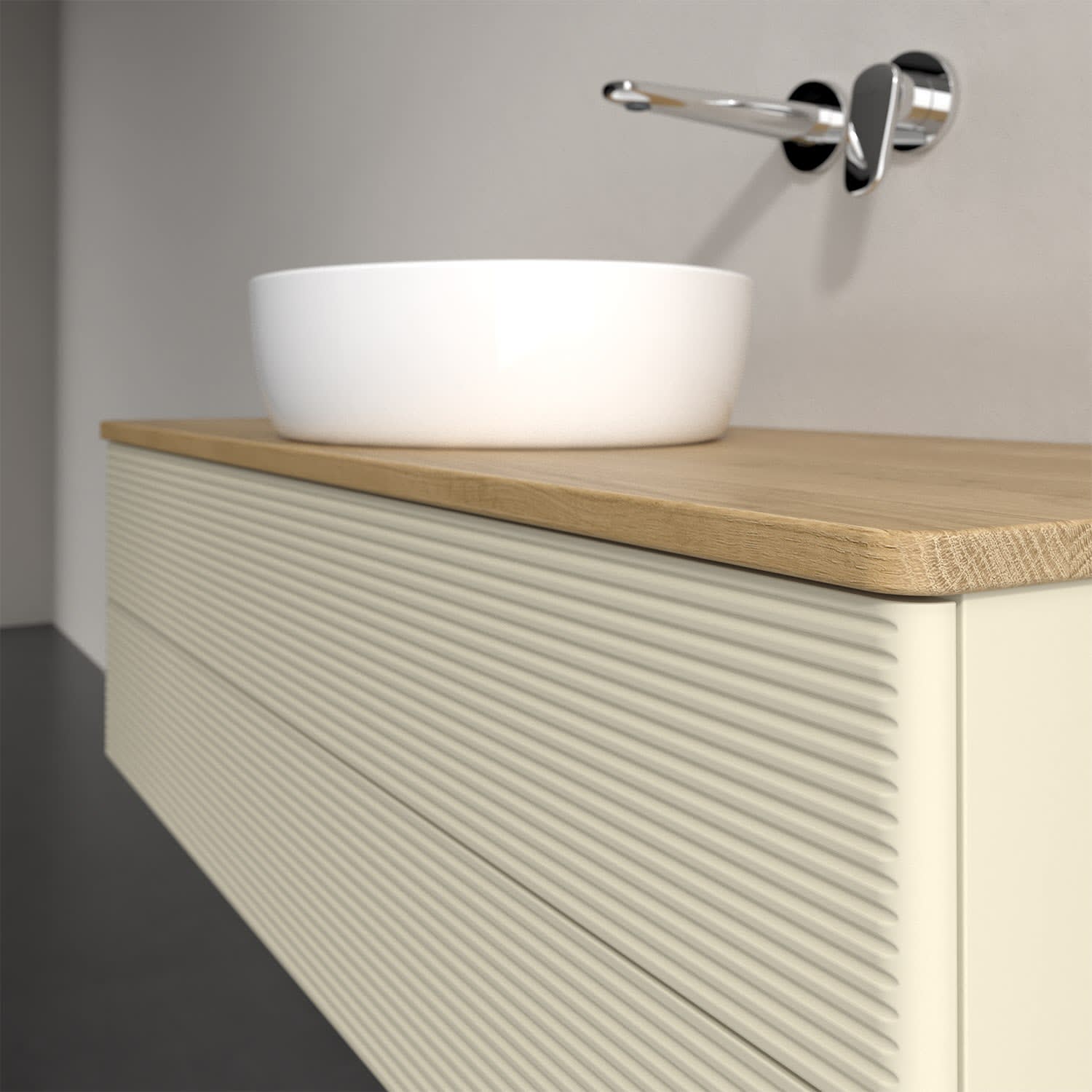 Der wandhängende Antao Waschtischunterschrank von Villeroy & Boch bietet nicht nur jede Menge Stauraum – er ist dank seines naturinspirierten Designs mit seinen abgerundeten Kanten auch noch besonders stilvoll und schafft eine gemütliche Atmosphäre im Badezimmer. Auf der Waschtischplatte bietet sich rechts und links neben dem Waschtisch viel Platz für Zahnbürstenbecher oder Seifenspender. Zwei geräumige Auszüge bieten viel Platz, um alles Notwendige zu verstauen und Ordnung zu halten. Öffnen lassen sie sich durch leichten Druck auf die strukturierte Front. Dabei aktiviert sich übrigens die Auszugsbeleuchtung in angenehmem Warmweiß. Dank Vollauszug hat man immer alles im Blick und der Antirutschboden verhindert ein Umfallen oder Verrutschen der Gegenstände. Einfach clever! Für eine besonders leichte Pflege sorgt die mehrschichtig deckend lackierte Oberfläche. Bei der Ausführung in Massivholz wird dank des verarbeiteten Massivholzes jedes Möbel zu einem Unikat, das sich durch das lebendige Naturmaterial durch seine einzigartige Struktur und Maserung auszeichnet.