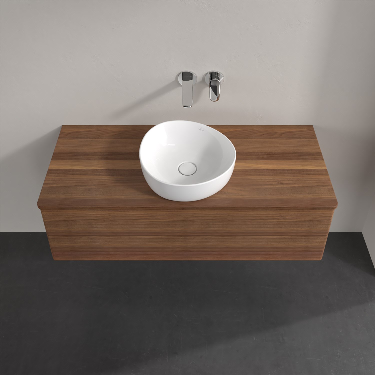 Der wandhängende Antao Waschtischunterschrank von Villeroy & Boch bietet nicht nur jede Menge Stauraum – er ist dank seines naturinspirierten Designs mit seinen abgerundeten Kanten auch noch besonders stilvoll und schafft eine gemütliche Atmosphäre im Badezimmer. Auf der Waschtischplatte bietet sich rechts und links neben dem Waschtisch viel Platz für Zahnbürstenbecher oder Seifenspender. Zwei geräumige Auszüge bieten viel Platz, um alles Notwendige zu verstauen und Ordnung zu halten. Öffnen lassen sie sich durch leichten Druck auf die strukturierte Front. Dabei aktiviert sich übrigens die Auszugsbeleuchtung in angenehmem Warmweiß. Dank Vollauszug hat man immer alles im Blick und der Antirutschboden verhindert ein Umfallen oder Verrutschen der Gegenstände. Einfach clever! Für eine besonders leichte Pflege sorgt die mehrschichtig deckend lackierte Oberfläche. Bei der Ausführung in Massivholz wird dank des verarbeiteten Massivholzes jedes Möbel zu einem Unikat, das sich durch das lebendige Naturmaterial durch seine einzigartige Struktur und Maserung auszeichnet.