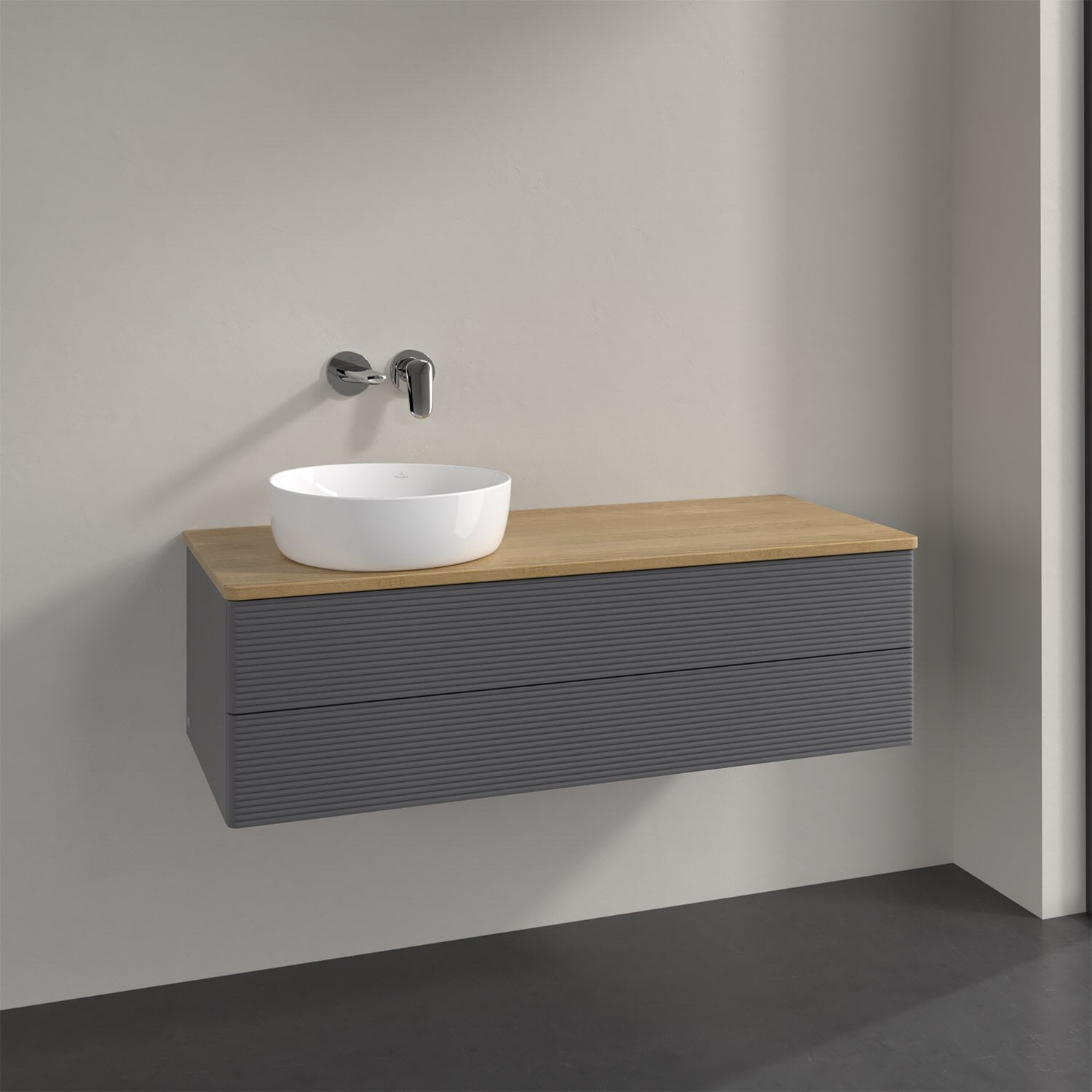 Villeroy & Boch Antao Waschbeckenunterschrank, 120 x 36 cm, 2 Auszüge mit LED-Licht, Front mit Struktur, ohne Hahnloch, für Waschtisch links