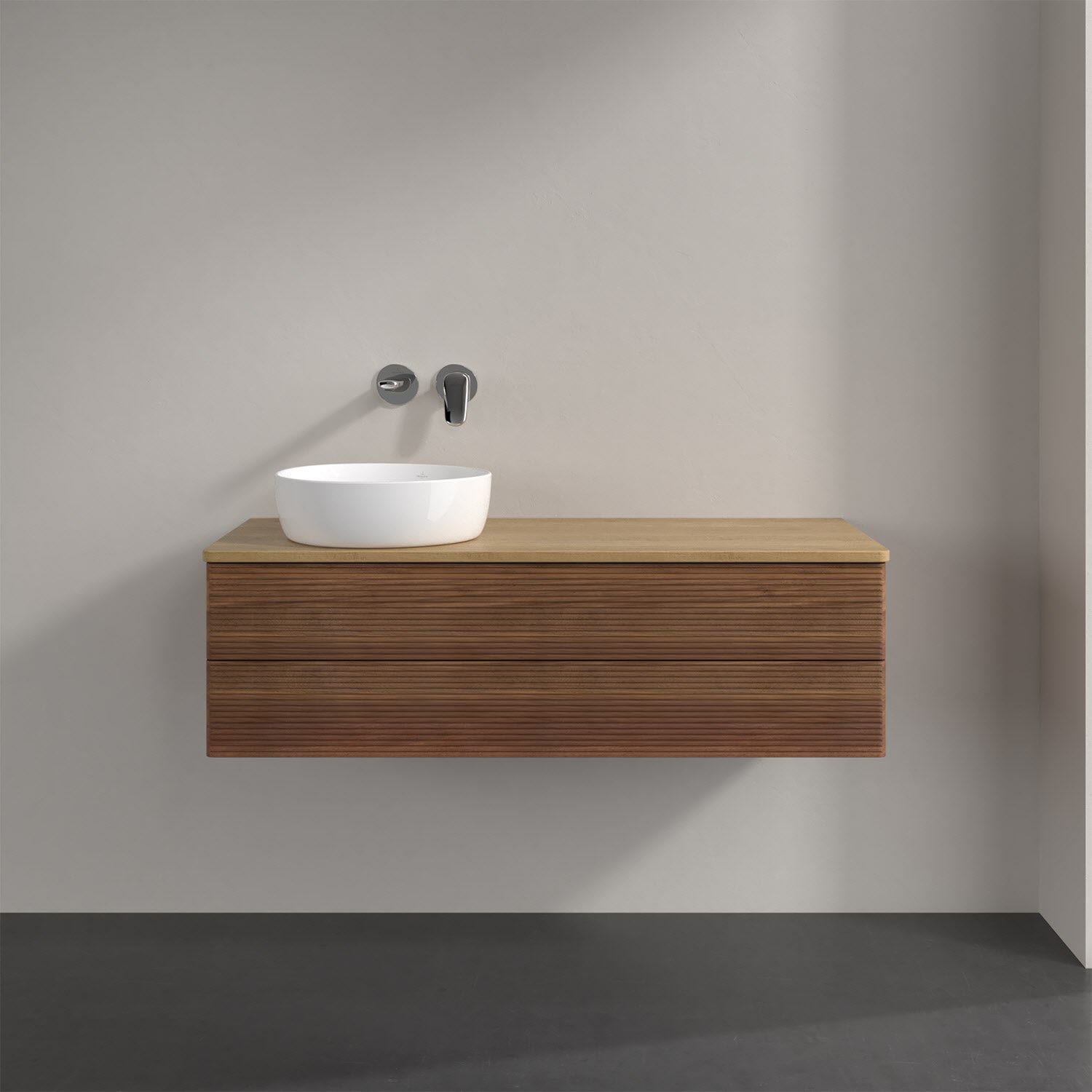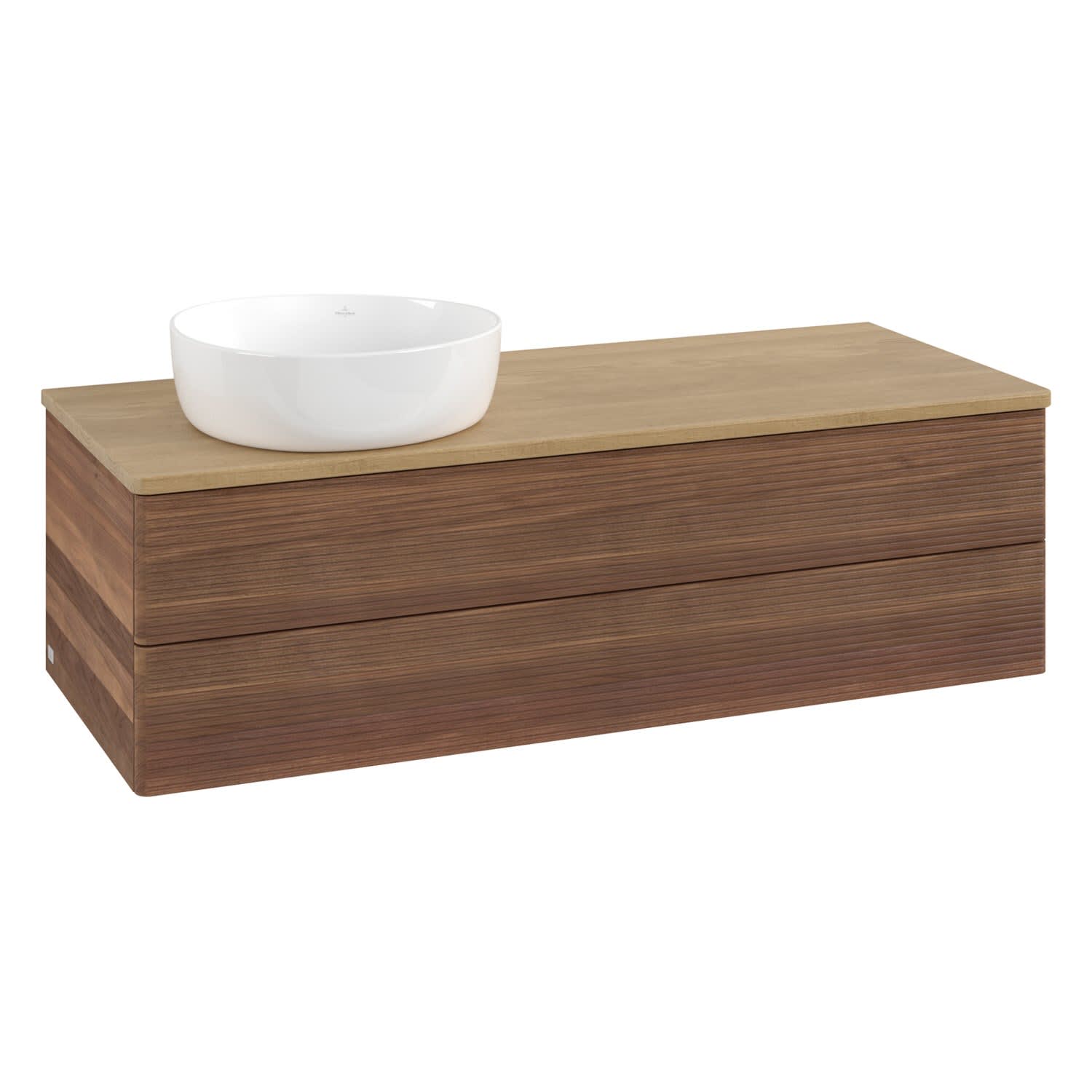 Villeroy & Boch Antao Waschbeckenunterschrank, 120 x 36 cm, 2 Auszüge mit LED-Licht, Front mit Struktur, ohne Hahnloch, für Waschtisch links